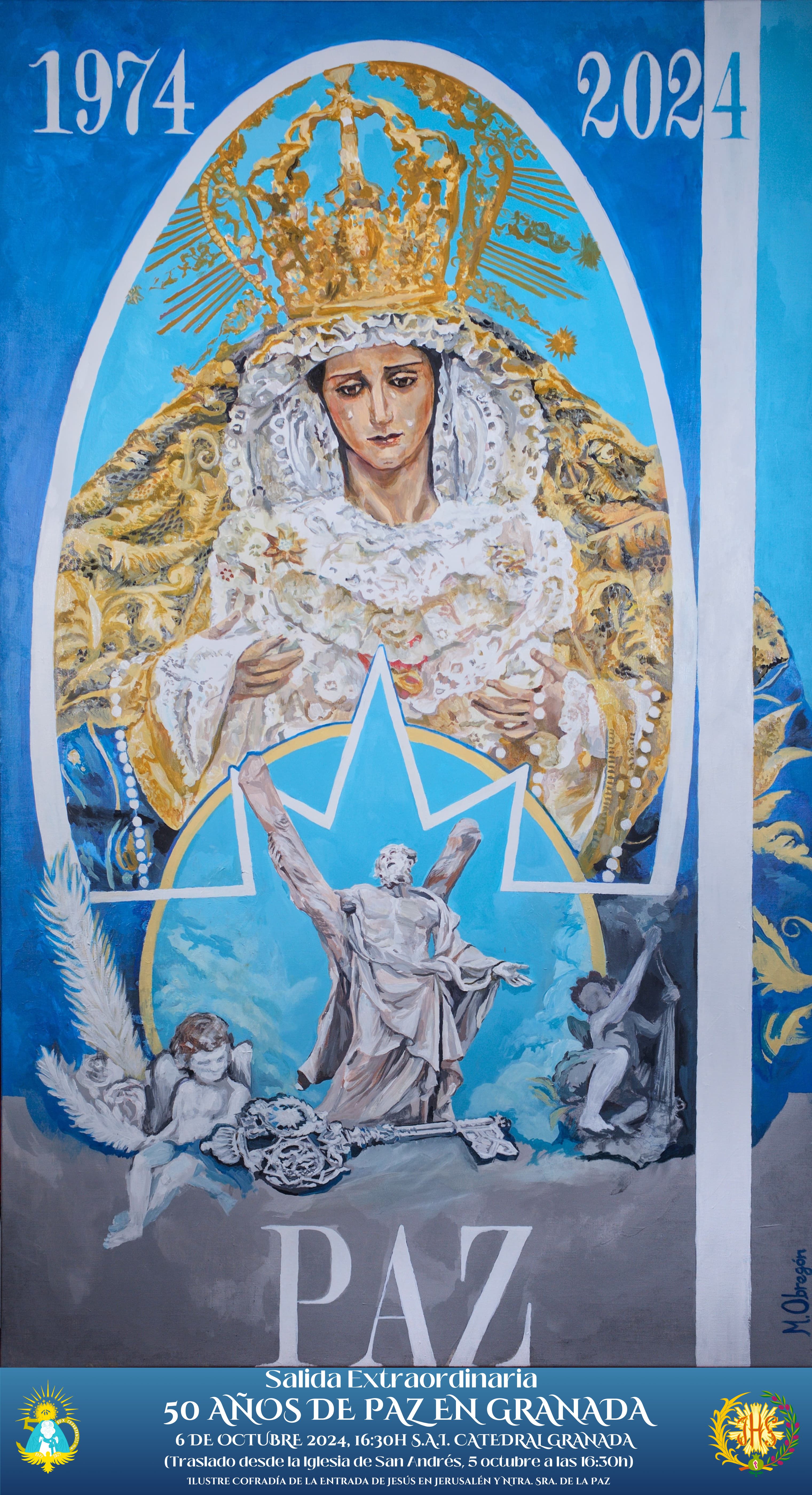 La pintura del cartel es obra de D. Manuel Obregón, hermano costalero de Ntra. Sra. de la Paz y pintor reconocido, al que le estamos eternamente agradecido y pedimos a Ntra. Sra. de la Paz que lo acompañe y proteja siempre.