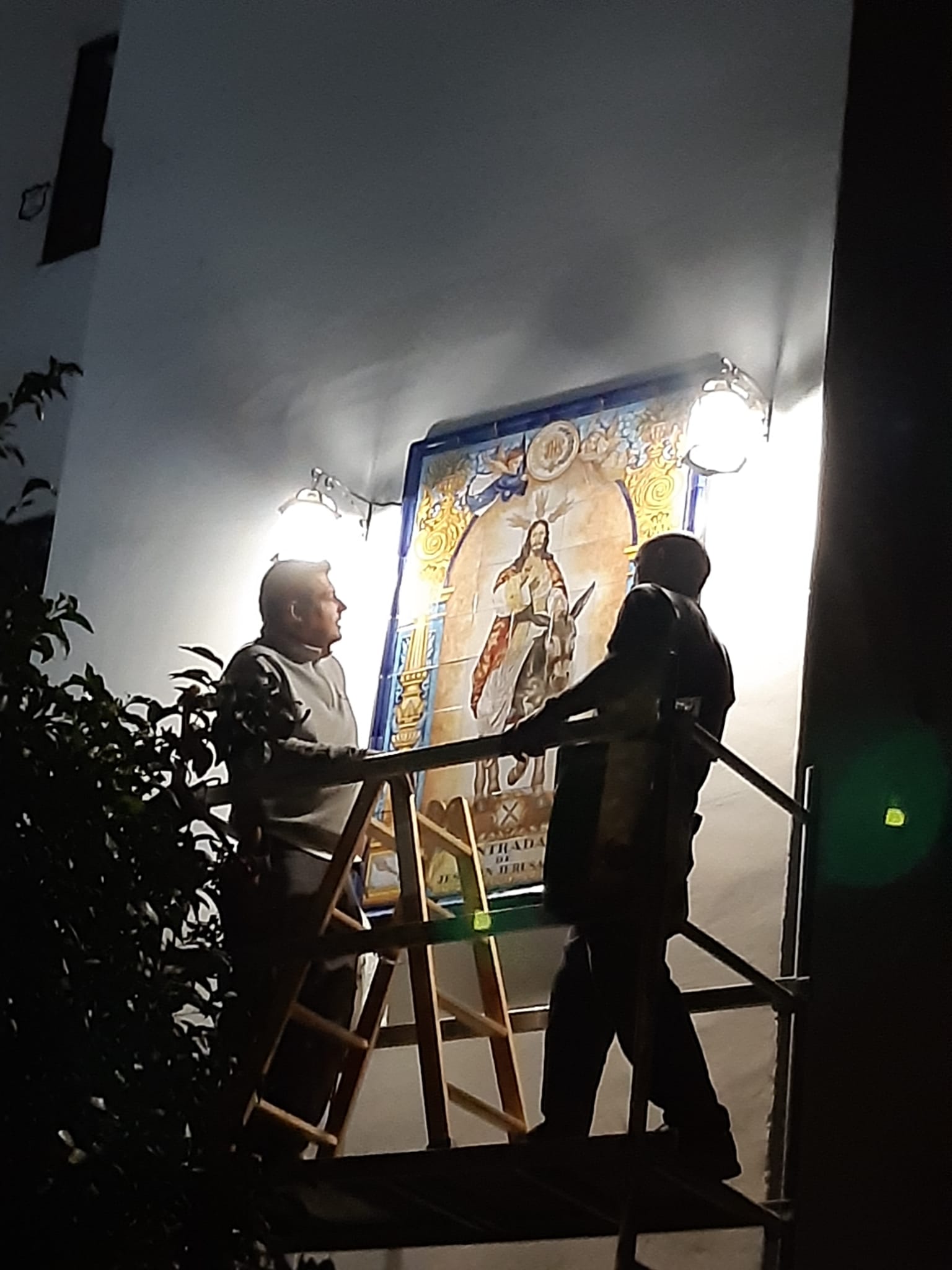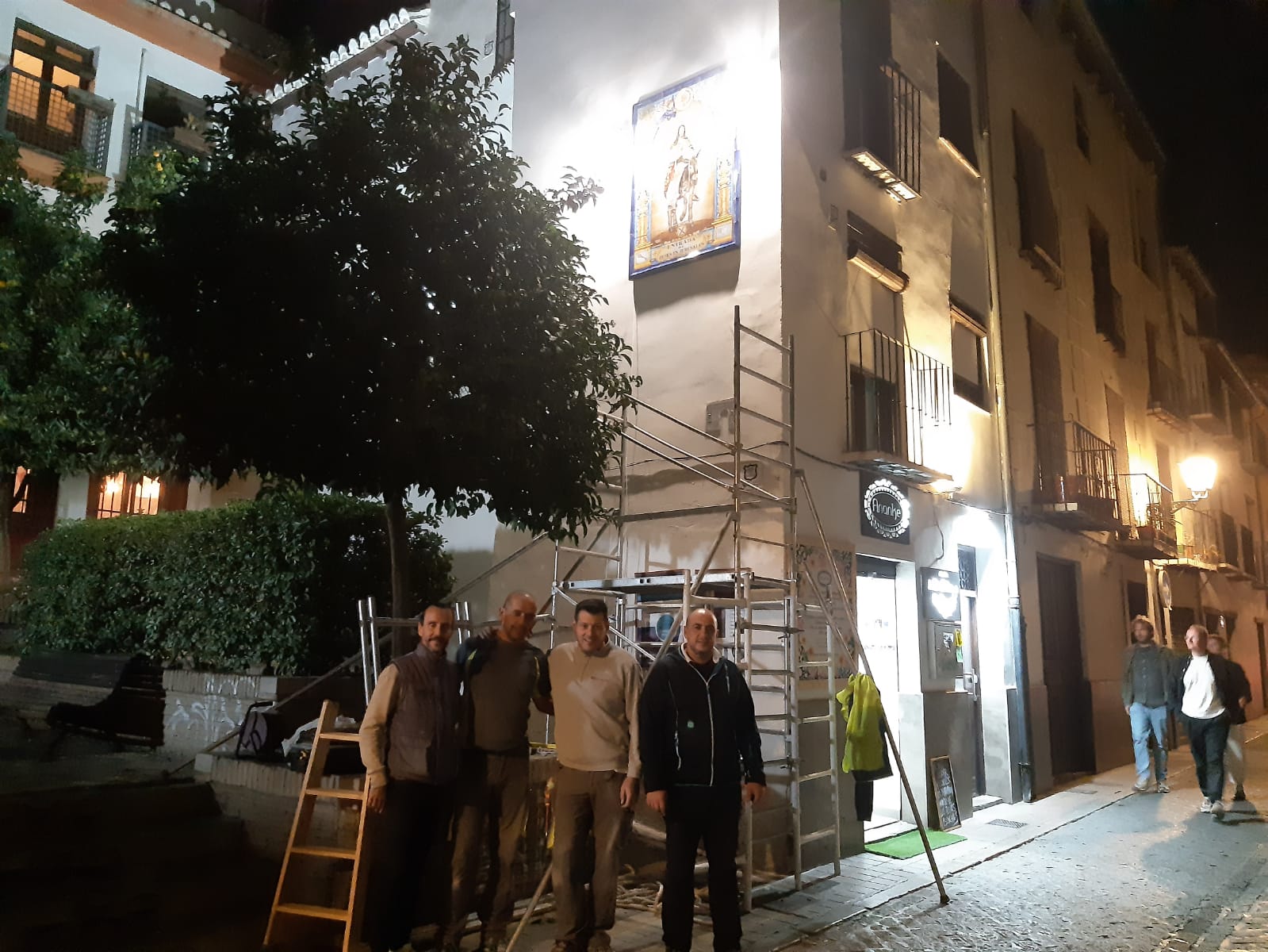 La bendición la realizó el párroco de la Iglesia de San Andrés y nuestro consiliario, D. Francisco Lorca, junto al Hermano Mayor, D. José A. Gámiz, el artesano y ceramista, D. Rafael Reina, la junta de gobierno, miembros de la comisión del 75 aniversario fundacional, familiares, amigos y vecinos del barrio.