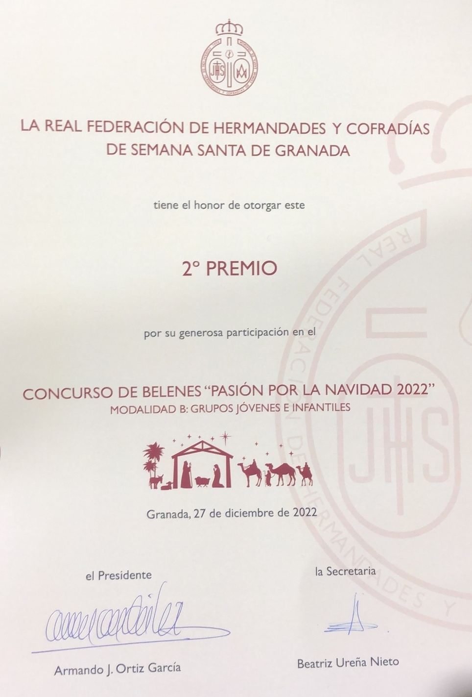 El 27 de noviembre del 2022 se celebró la festividad de San Juan Evangelista en el convento de las Comendadoras de Santiago con una nutrida representación de nuestra cofradía y la Real Federación de Hermandades y Cofradías de Granada nos concedió el segundo premio por el belén infantil en la modalidad juvenil.