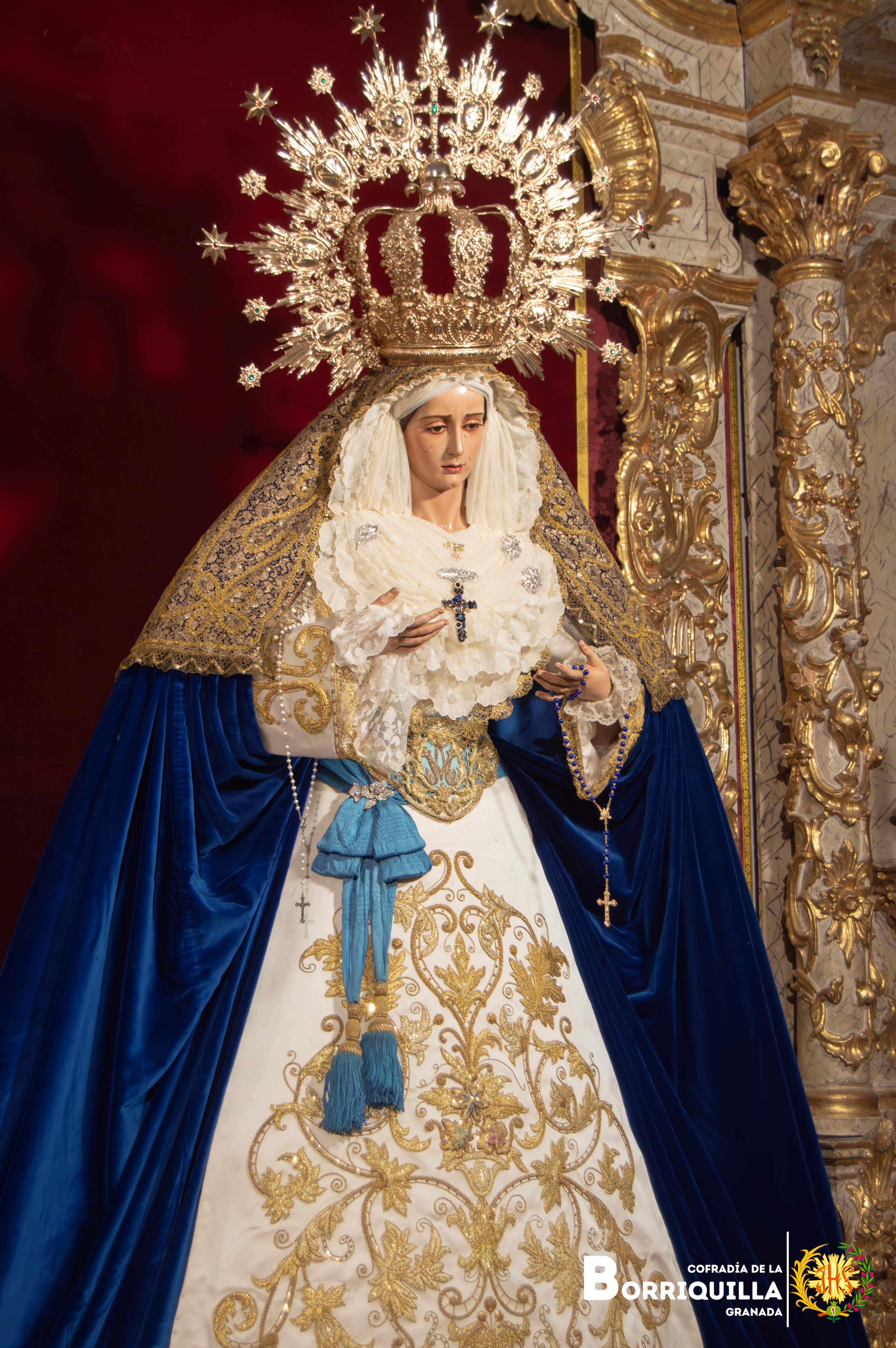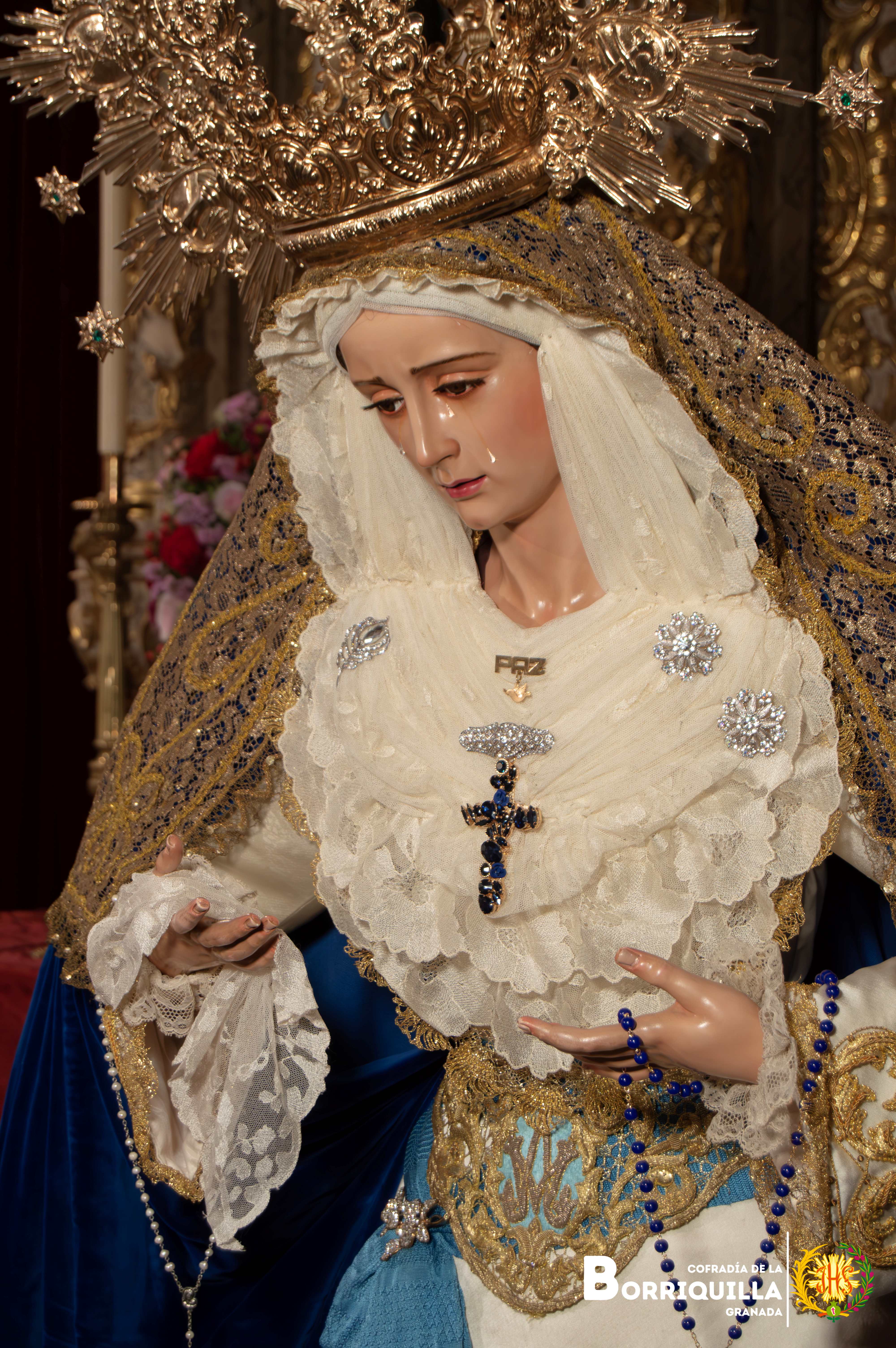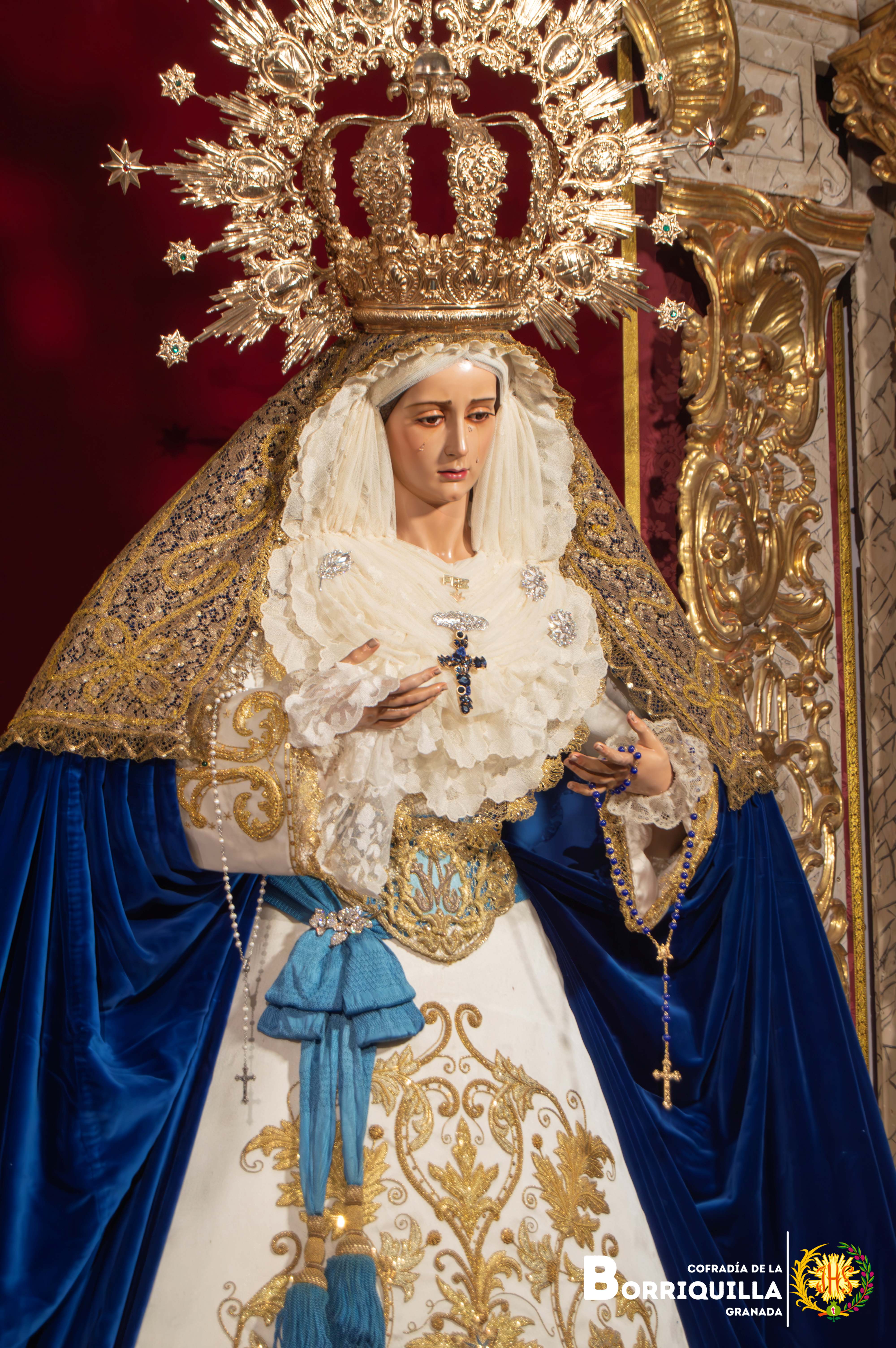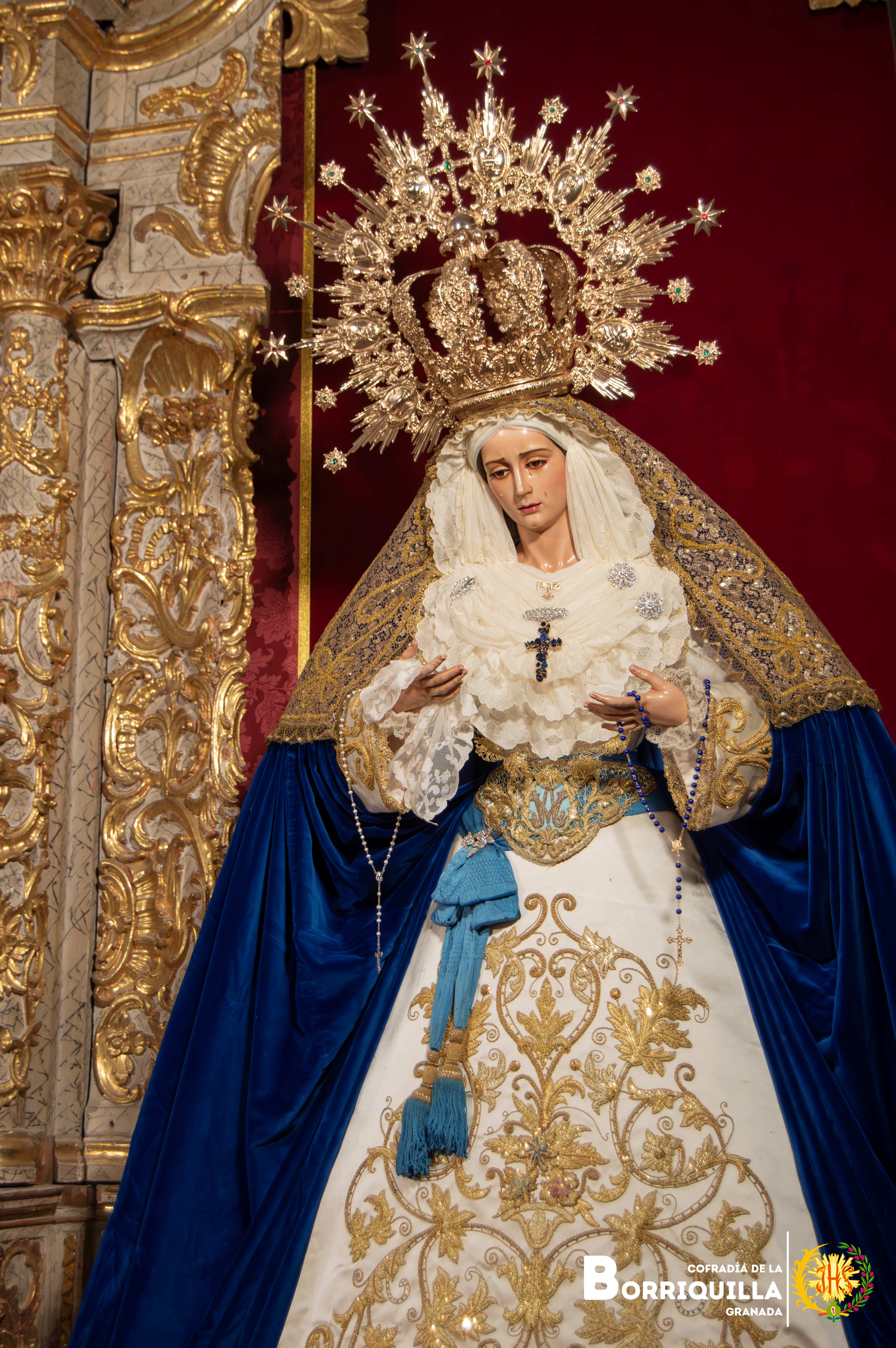 Ntra. Sra. de la Paz luce saya de recorte blanco, manto azul pavo y, como tocado, un mantilla granadina cedida para esta ocasión por una hermana. Además, luce la corona de los hnos. Moreno y toca de sobre manto de encaje francés de oro.