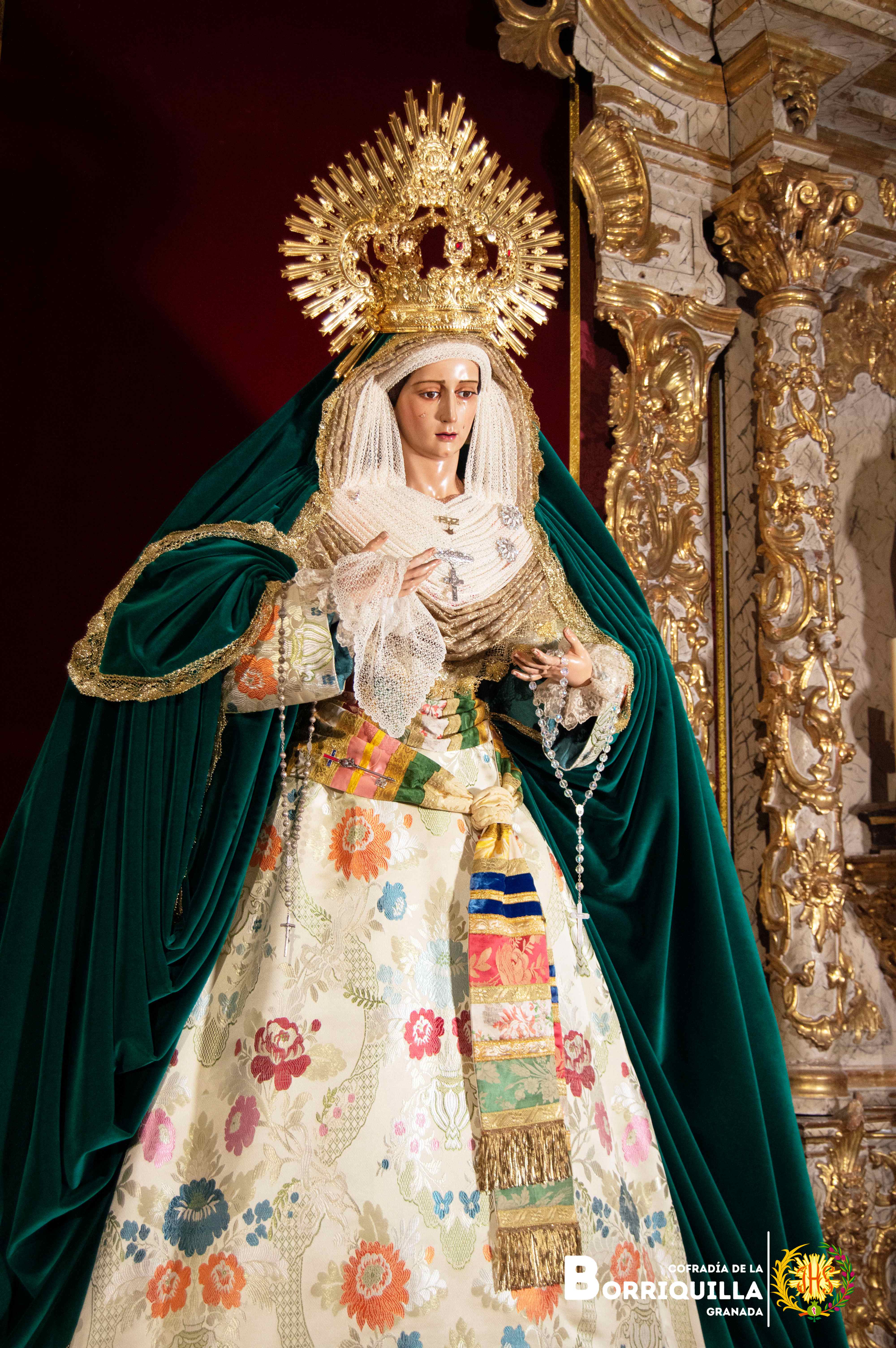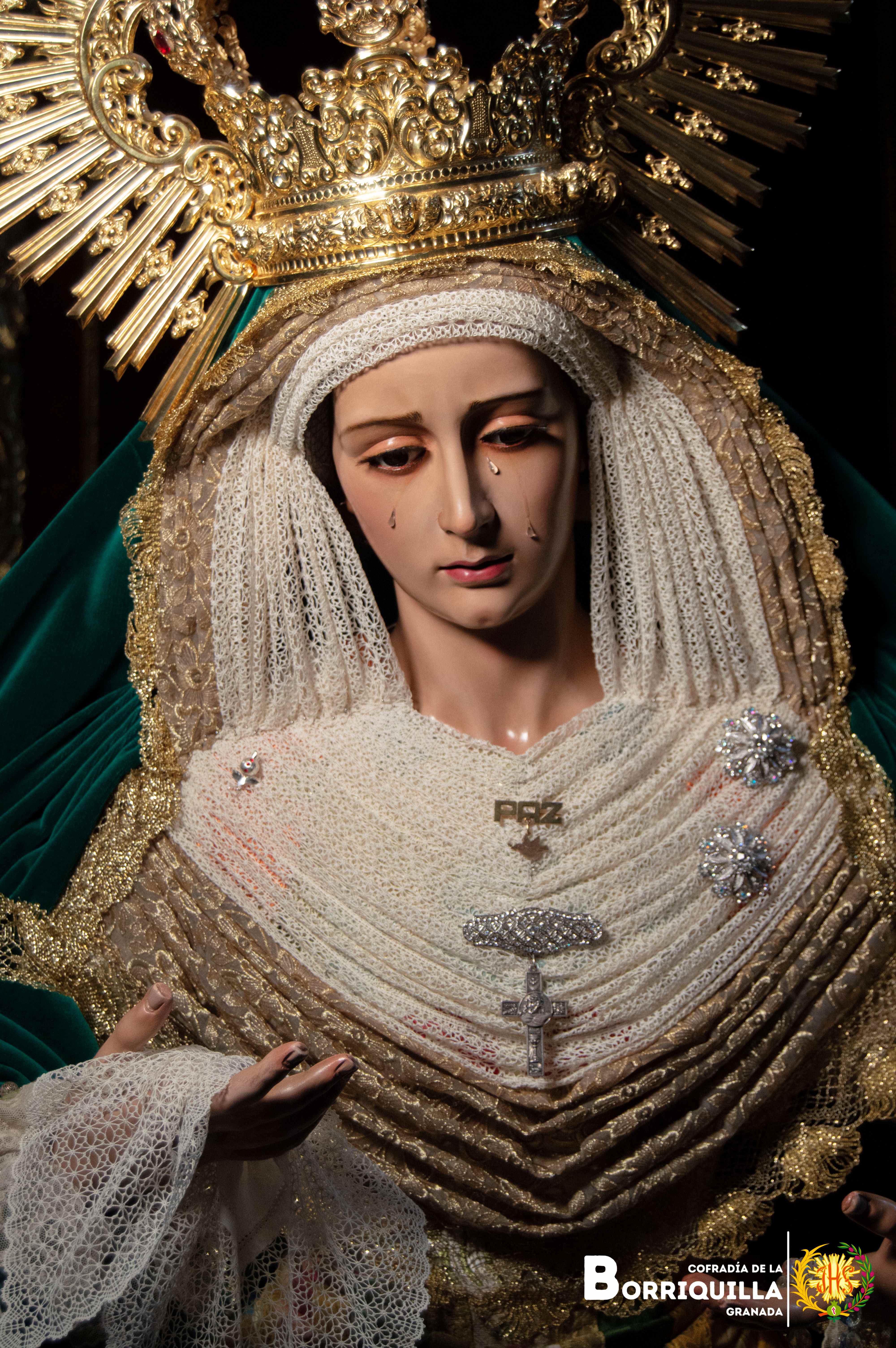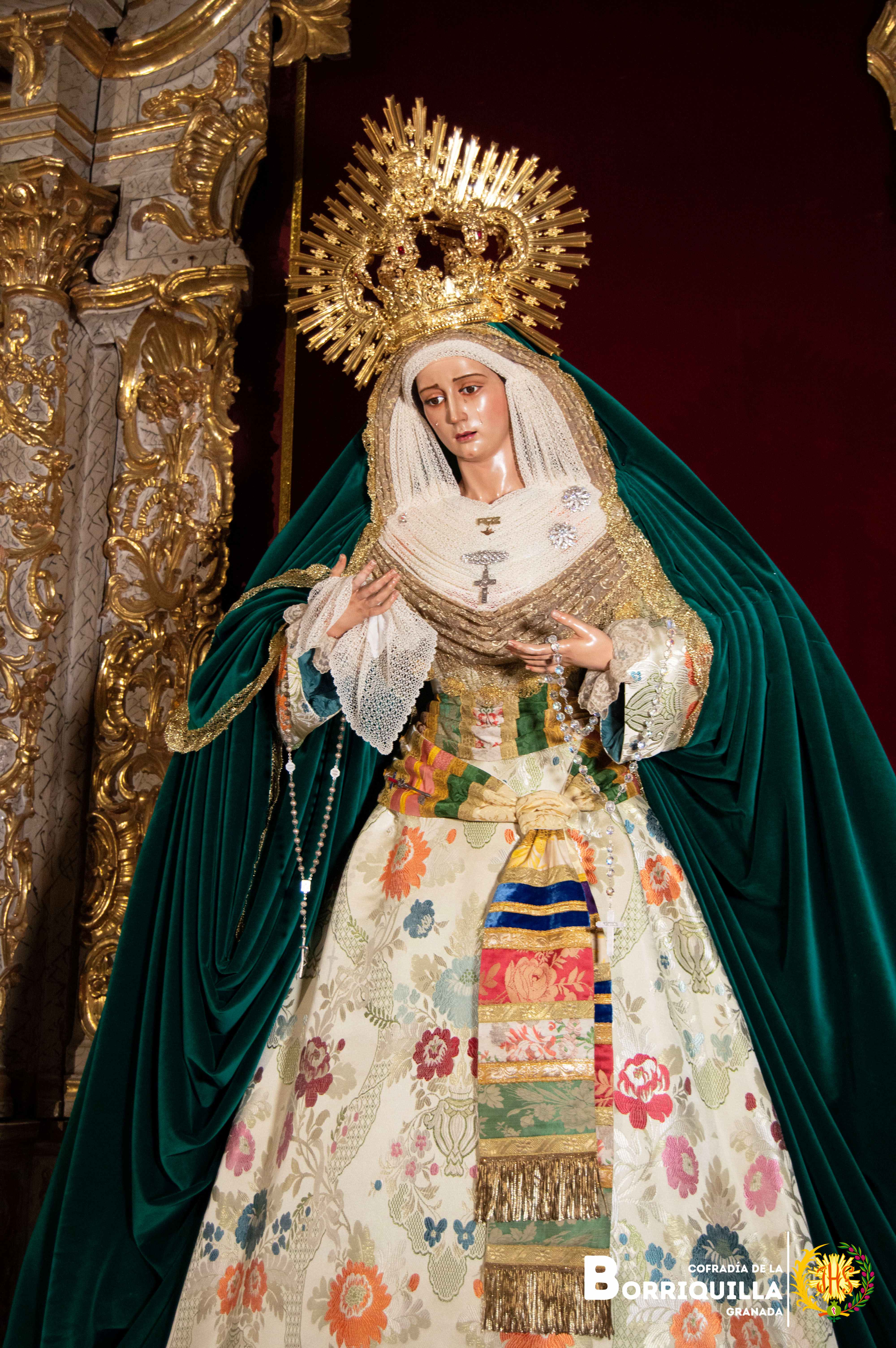 Así luce Ntra. Sra. de la Paz para el tiempo estival. Luce saya de brocado valenciano, manto de terciopelo verde, tocado elaborado con un encaje de bolillos y encaje dorado. Luce la corona de capilla de 2018.