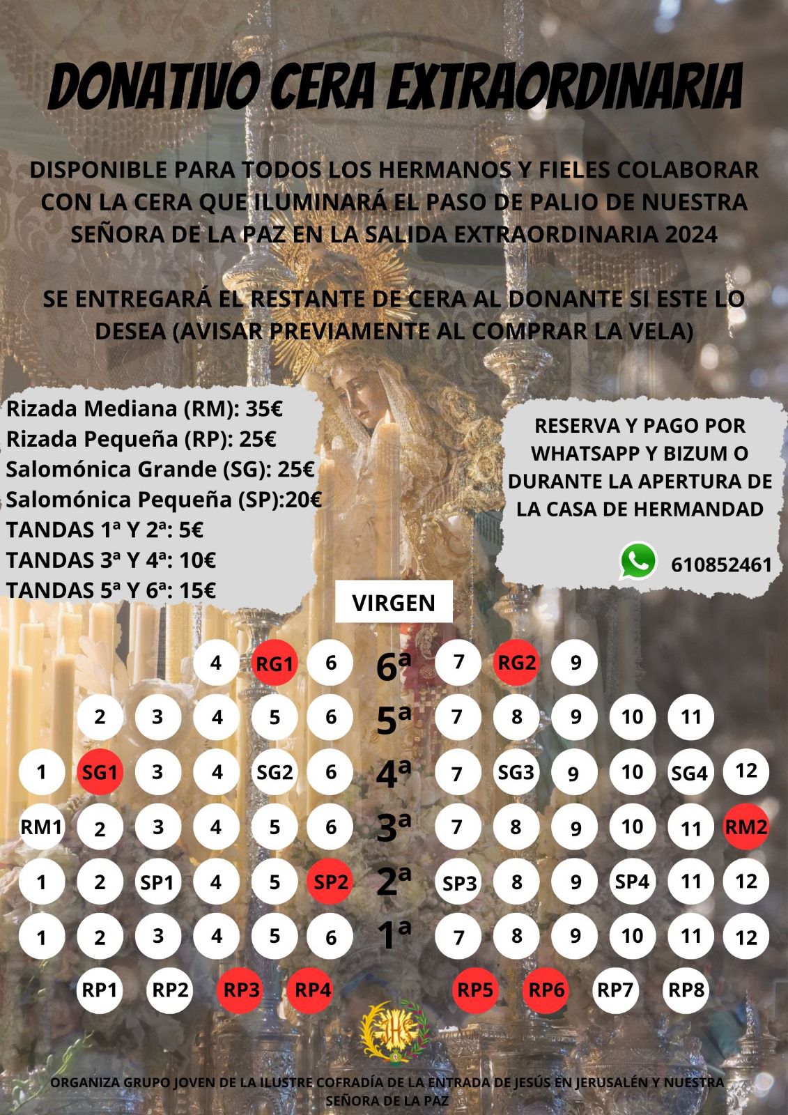 Si deseas colaborar con tu donativo para iluminar el caminar de nuestra Madre puedes reservar y pagar por Whatsapp / Bizum al Tlf. 610852461 o durante la retirada de tarjeta de sitio que se anunciará en breve.