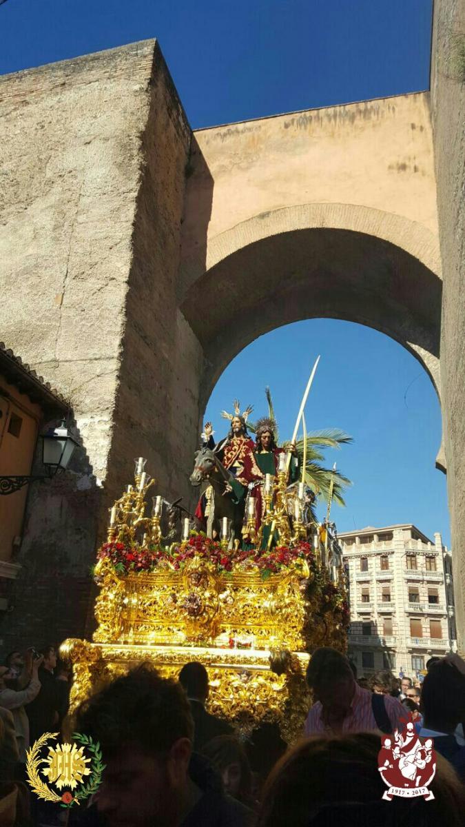 El misterio de la Entrada de Jesús en Jerusalén saldrá desde su sede canónica, la iglesia parroquial de San Andrés a las 18.00 horas en dirección al Arco Elvira, Profesor Emilio Orozco, Gran Vía, Jardines del Triunfo (Estación a los pies de la Inmaculada), Gran Vía, San Juan de Dios (Estación en la Basílica 19.30 h.), Santuario de Nuestra Señora del Perpetuo Socorro (Estación a las 19.40h), Gran Capitán, Duquesa, Málaga, Escuelas, Plaza de la Universidad, iglesia de los Santos Mártires Justo y Pastor (Estación a las 20.45 h.), Plaza de la Encarnación, Niños Luchando, Cocheras de Santa Paula, Santa Paula, Marqués de Falces, iglesia de Santiago (Estación a las 22 h.), Elvira, regreso a su templo la iglesia parroquial de San Andrés a las 22.30 horas.