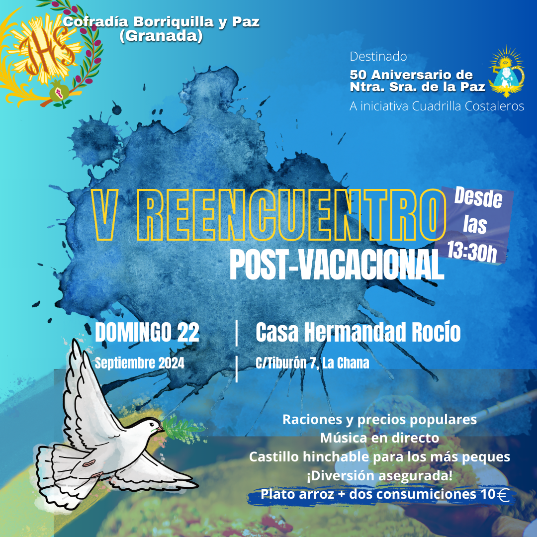 Un año más, y ya van cinco, os invitamos al V Encuentro Post-Vacacional orientado este año, por iniciativa de la cuadrilla de costaleros, a la celebración del 50 Aniversario de Ntra. Sra. de la Paz y colaborar con los gastos de la salida extraordinaria.