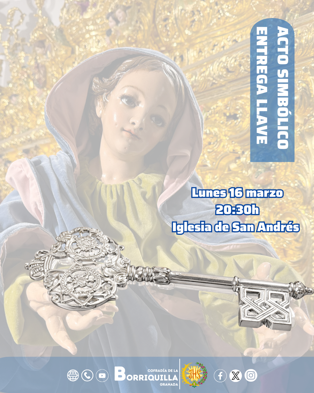 Desde la Ilustre Cofradía de la Entrada en Jerusalén y Ntra. Sra. de la Paz tenemos el gusto de invitar a tod@s sus herman@s, así como a cofrades y granadinos al "Acto de la Entrega de la Llave" a la Hermandad de Nuestra Señora de las Angustias Coronada de Santa María de la Alhambra de Granada.