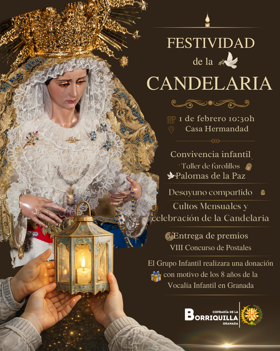 La Festividad de la Candelaria nos invita a celebrar a María como portadora de la Luz, aquella que presenta a su Hijo al mundo. En nuestra Hermandad, esta luz adquiere un significado muy especial cuando son los niños quienes la simbolizan, ofreciendo a la Virgen de la Paz el fruto de su trabajo, su ilusión y su fe sencilla.