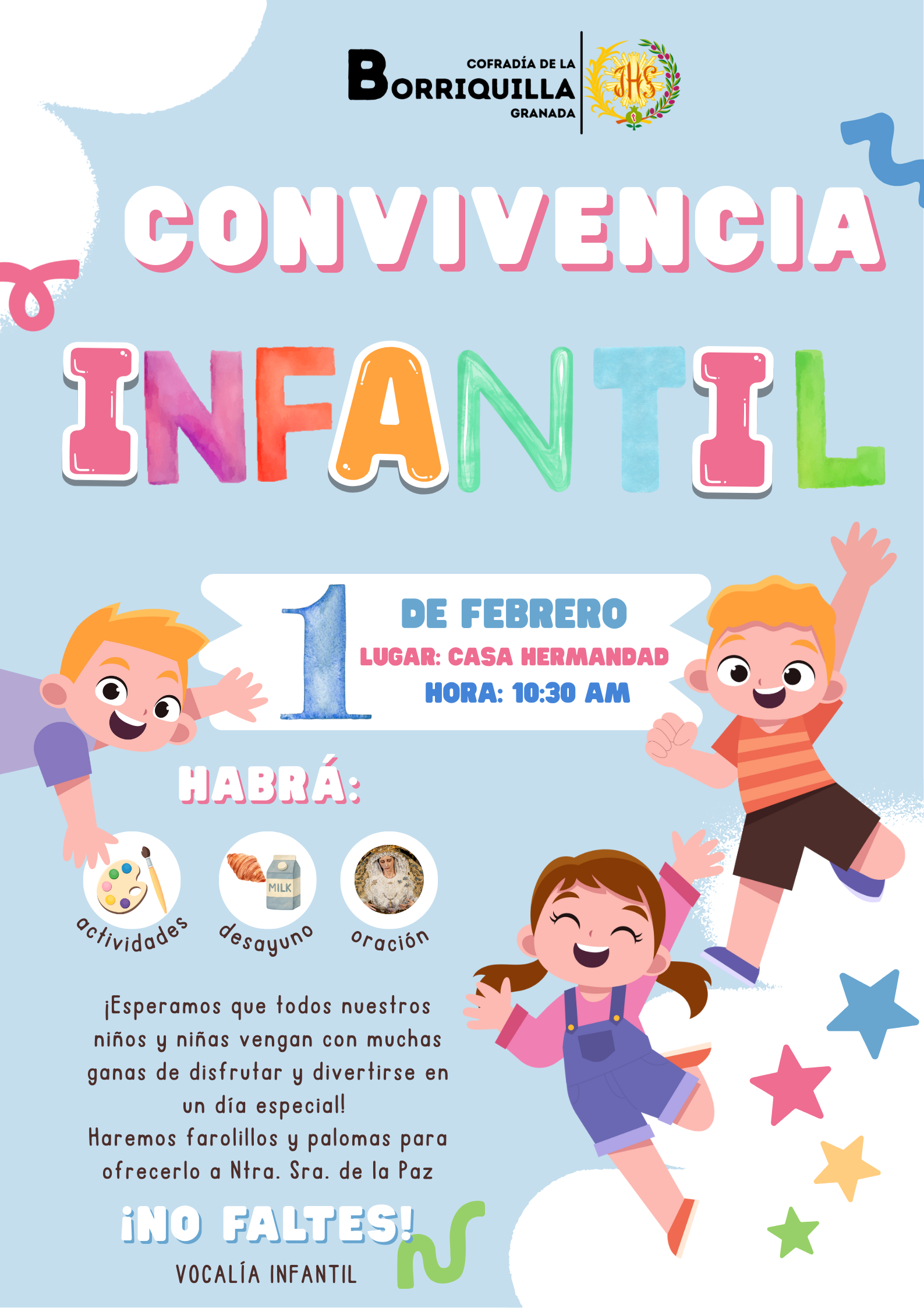 10:30h Convivencia infantil, en la que los niños y niñas de la Hermandad realizarán farolillos y palomas de la Paz, manualidades que posteriormente ofrecerán a Nuestra Señora de la Paz durante la celebración de la Santa Misa. Así como tendrán un desayuno compartido, por favor confirmar asistencia para preparar todo en el correo gjoven@borriquilla.es a la atención de Amparo Almohalla (vocal del grupo infantil)