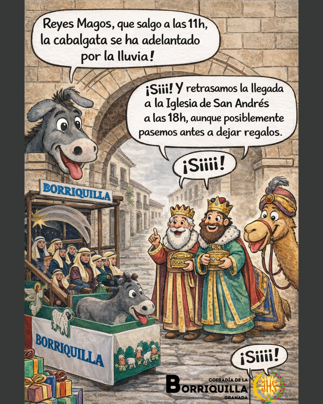 El Ayuntamiento de Granada informa de que la Cabalgata de Reyes Magos 2026 adelanta su horario de salida a las 11:00 horas de la mañana, debido a la previsión meteorológica.