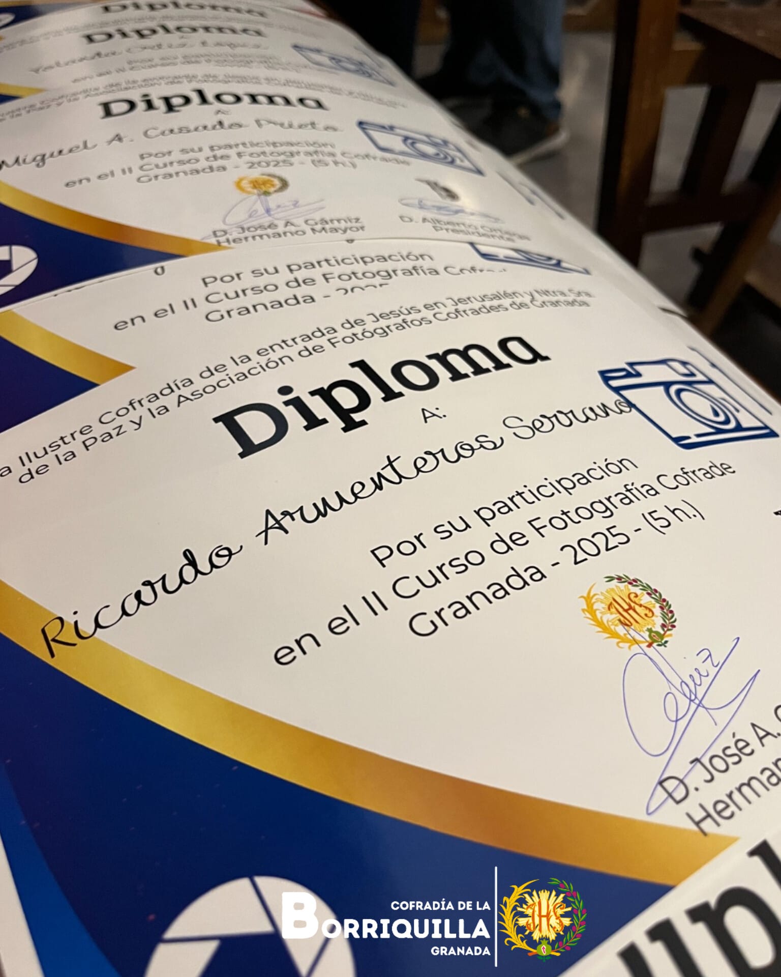 El curso finalizó con la entrega de diplomas por parte del Hermano Mayor, José Antonio Gámiz, junto a Álvaro Caño, miembro de la Junta de Gobierno y del equipo de comunicación, quienes destacaron la importancia de esta formación y agradecieron a FocoGranada y a los ponentes su implicación.