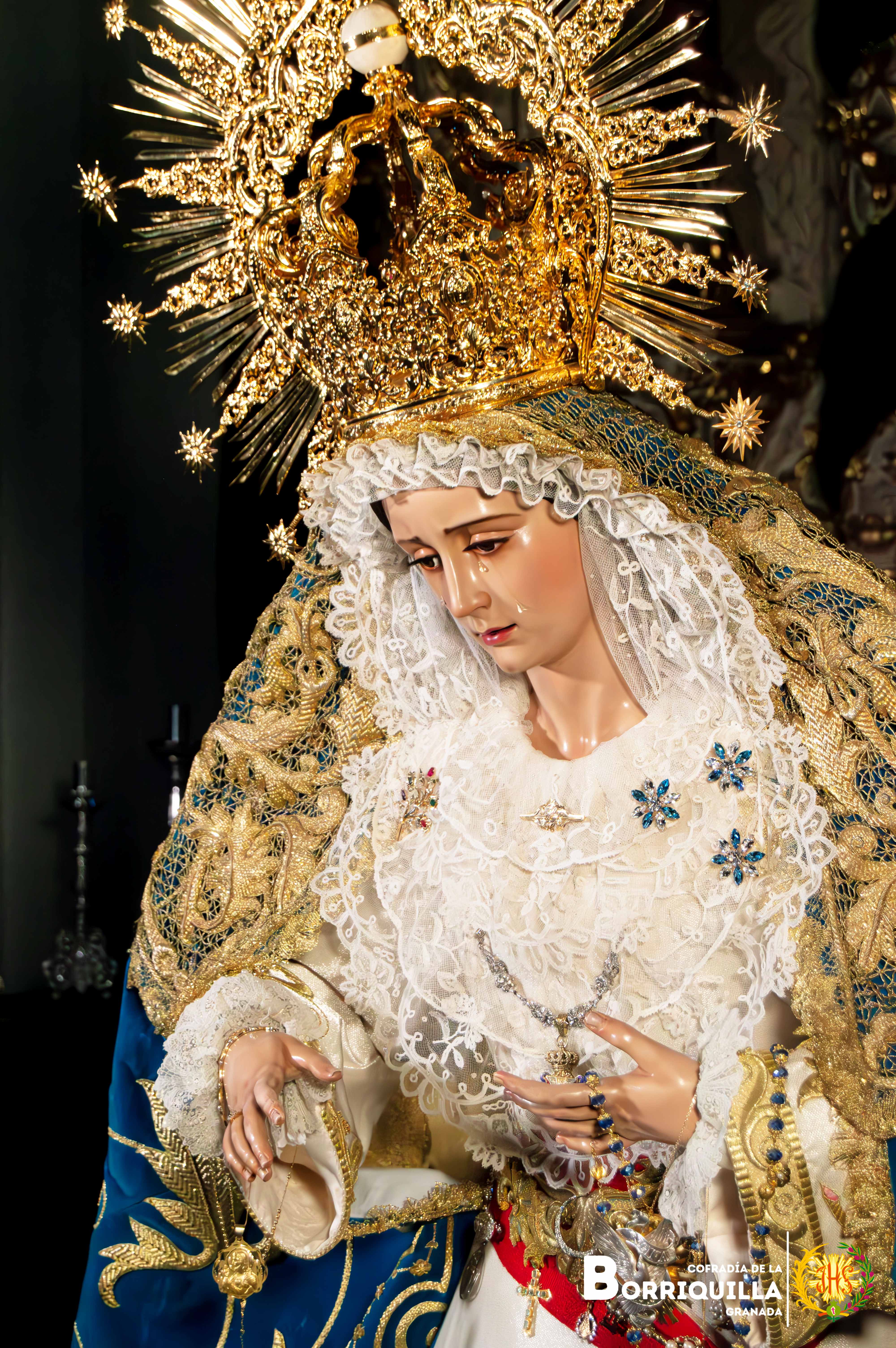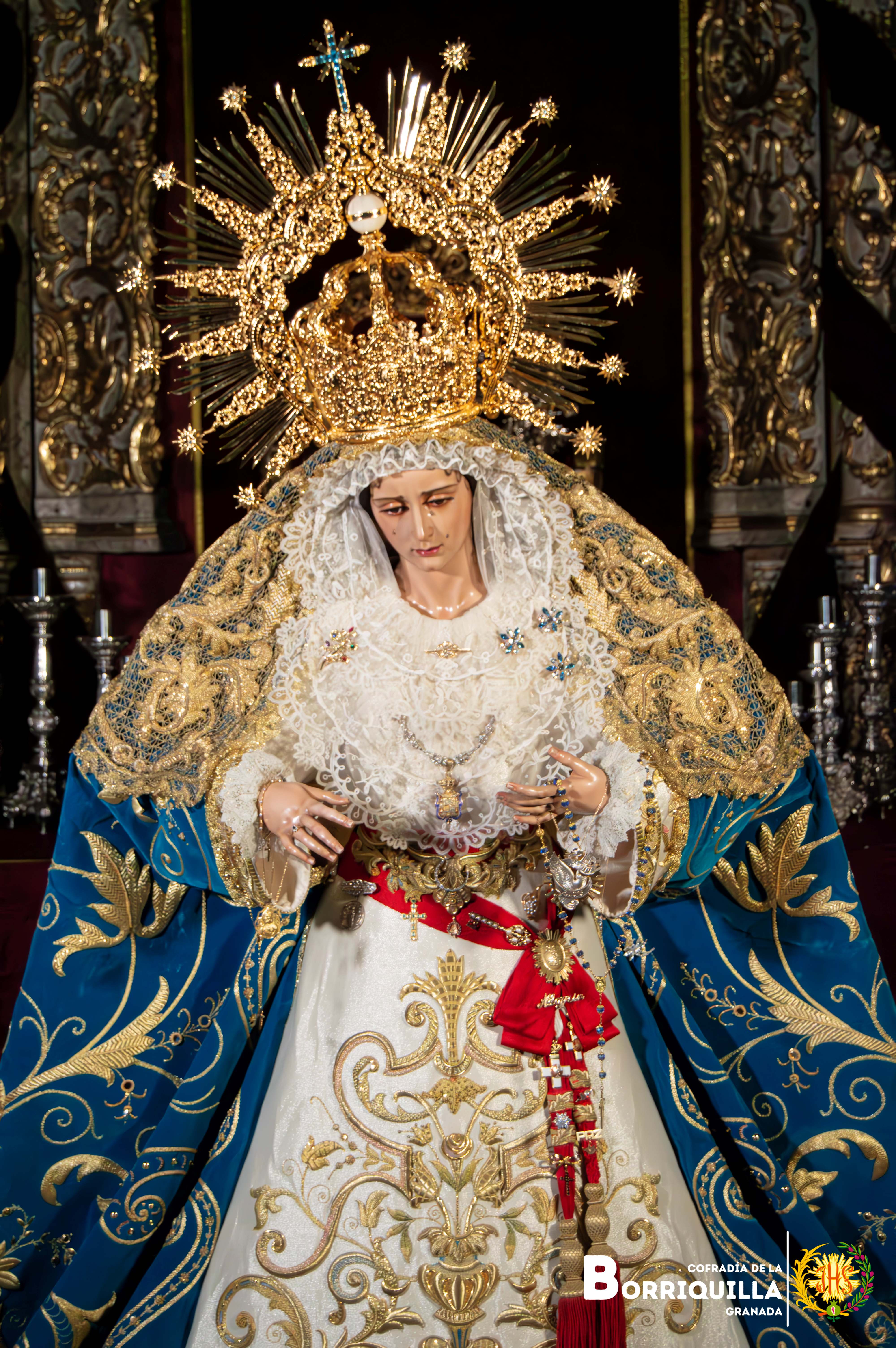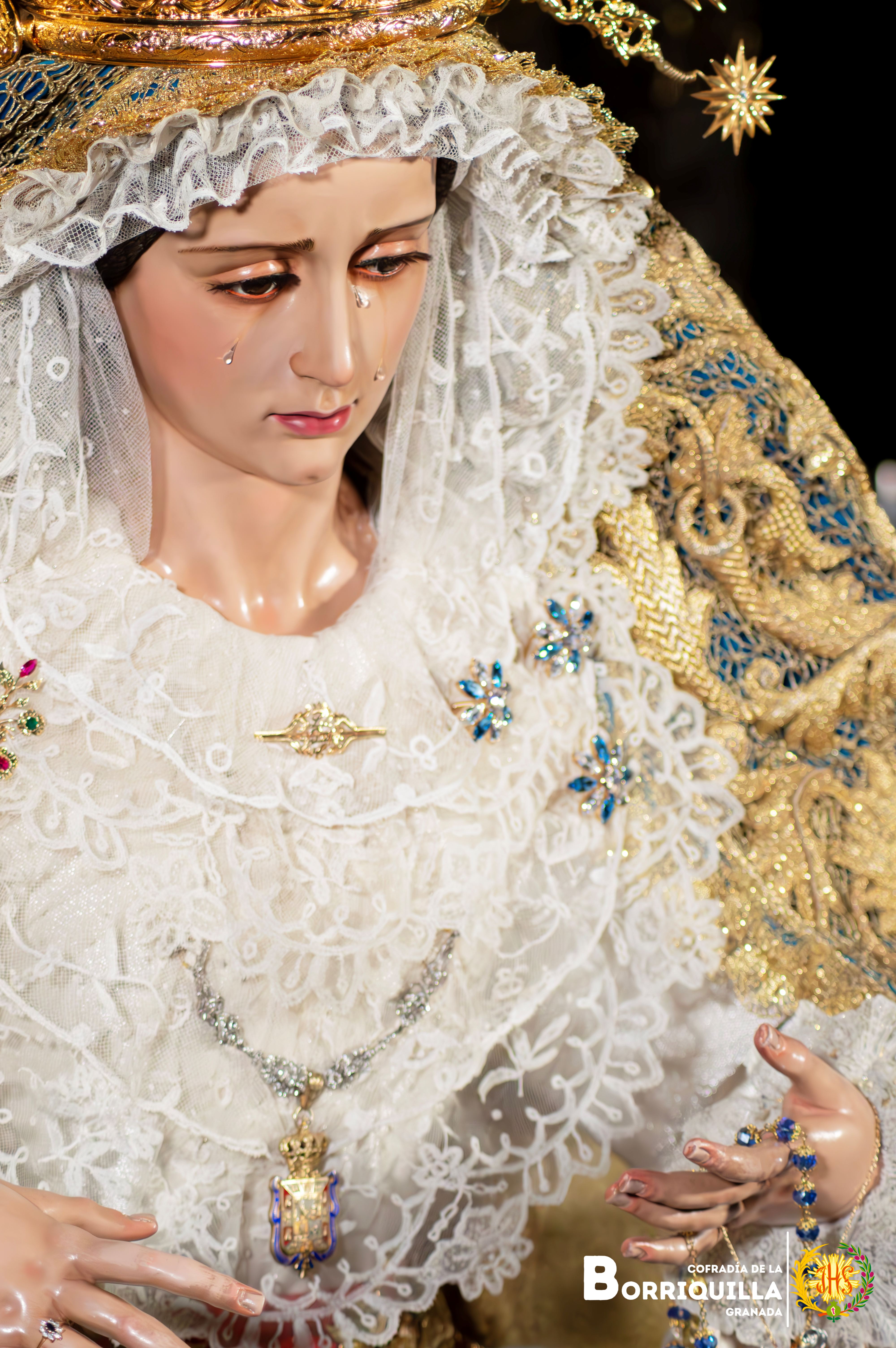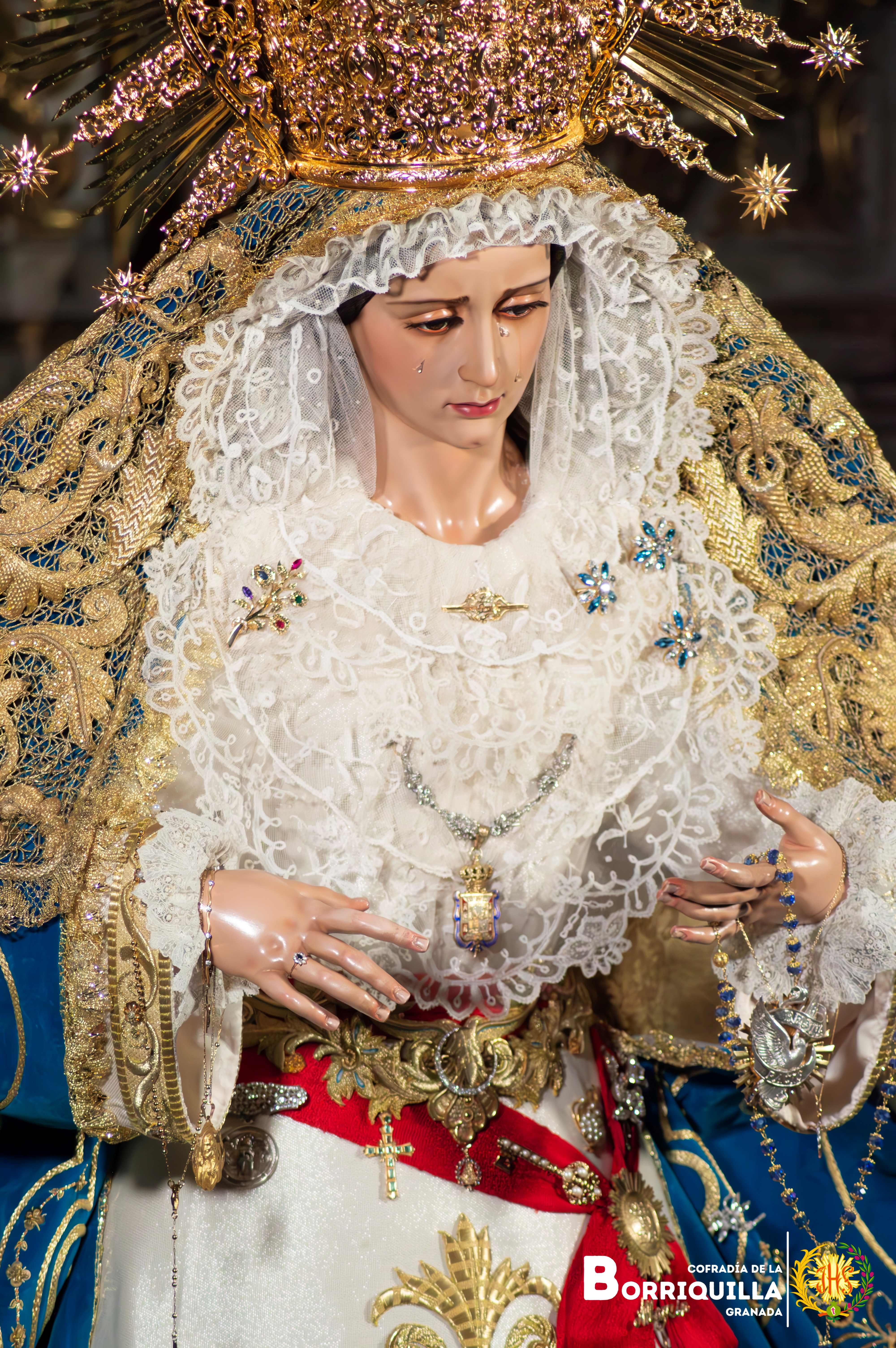 Como novedad, estrena unas tembladeras elaboradas con piedras preciosas en todos azules y blancos donadas por un hermano de la cofradía, además, del estreno de la peana de besamanos y cultos elaborada por Paula Orfebres de la localidad cordobesa de Lucena.