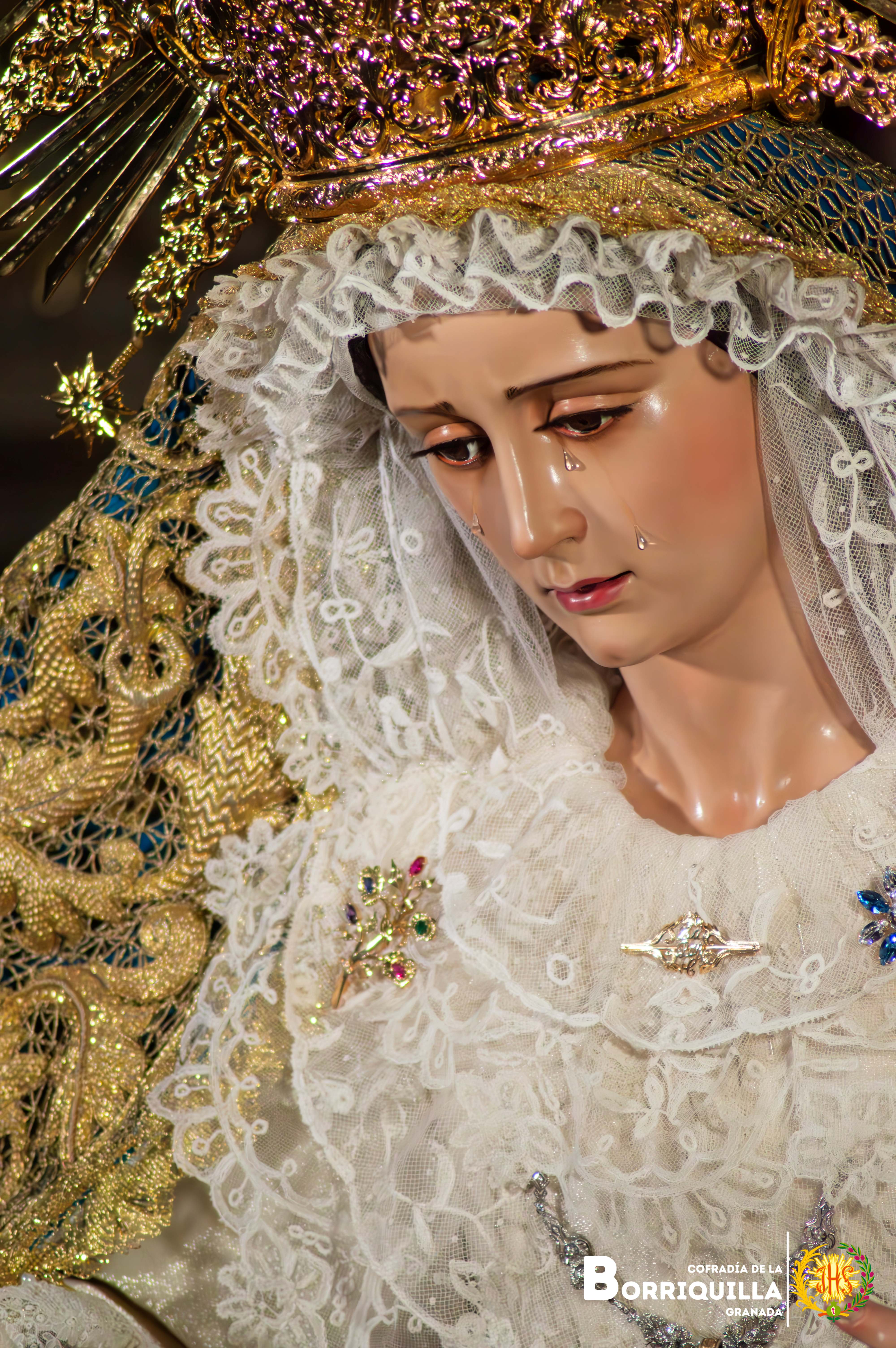 Nuestra Señora de la Paz, Madre que engendra la paz verdadera, nos recuerda que la paz nace del amor entregado. Para la ocasión luce sus mejores galas, con la saya bordada en hilos de oro y sedas de colores sobre tisú de plata, el manto del L aniversario bordado sobre terciopelo azul turquesa, la toca de sobremanto bordada en oro y su corona de salida. Luce tocado elaborado magistralmente por su vestidor D. Jorge Heredia con encajes de aplicación de Bruselas.