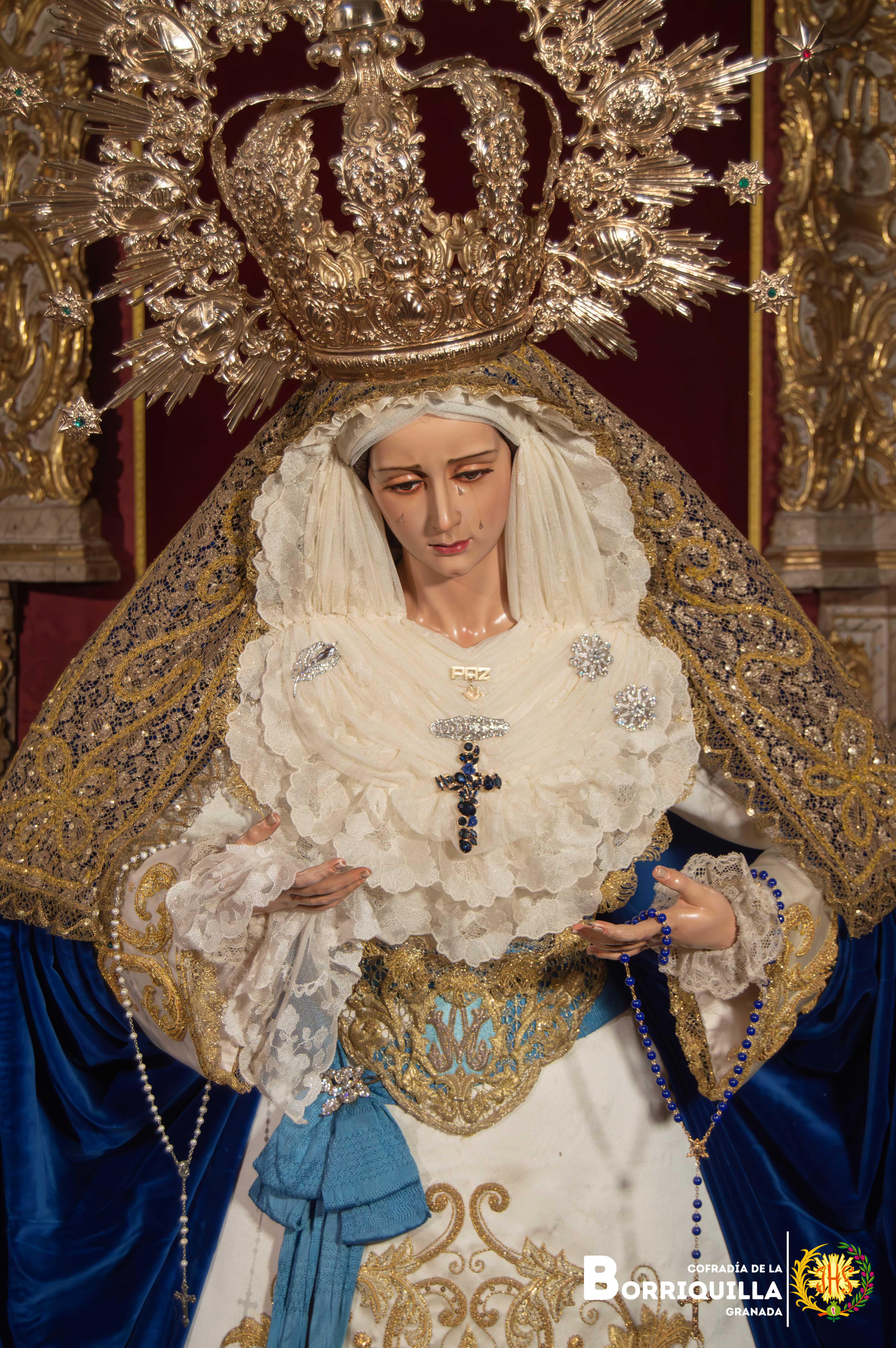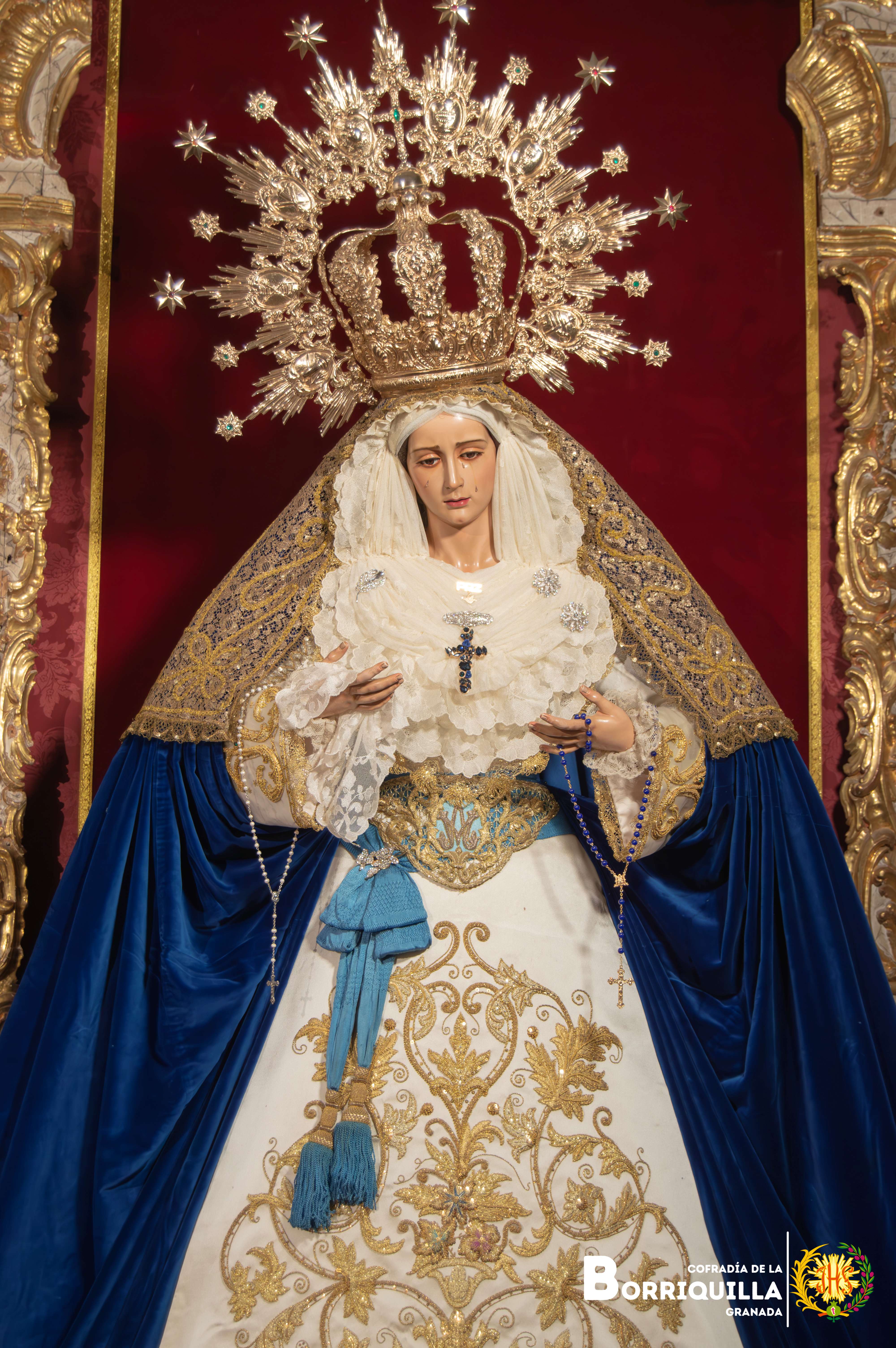 Ntra. Sra. de la Paz luce saya de recorte blanco, manto azul pavo y, como tocado, un mantilla granadina cedida para esta ocasión por una hermana. Además, luce la corona de los hnos. Moreno y toca de sobre manto de encaje francés de oro.
