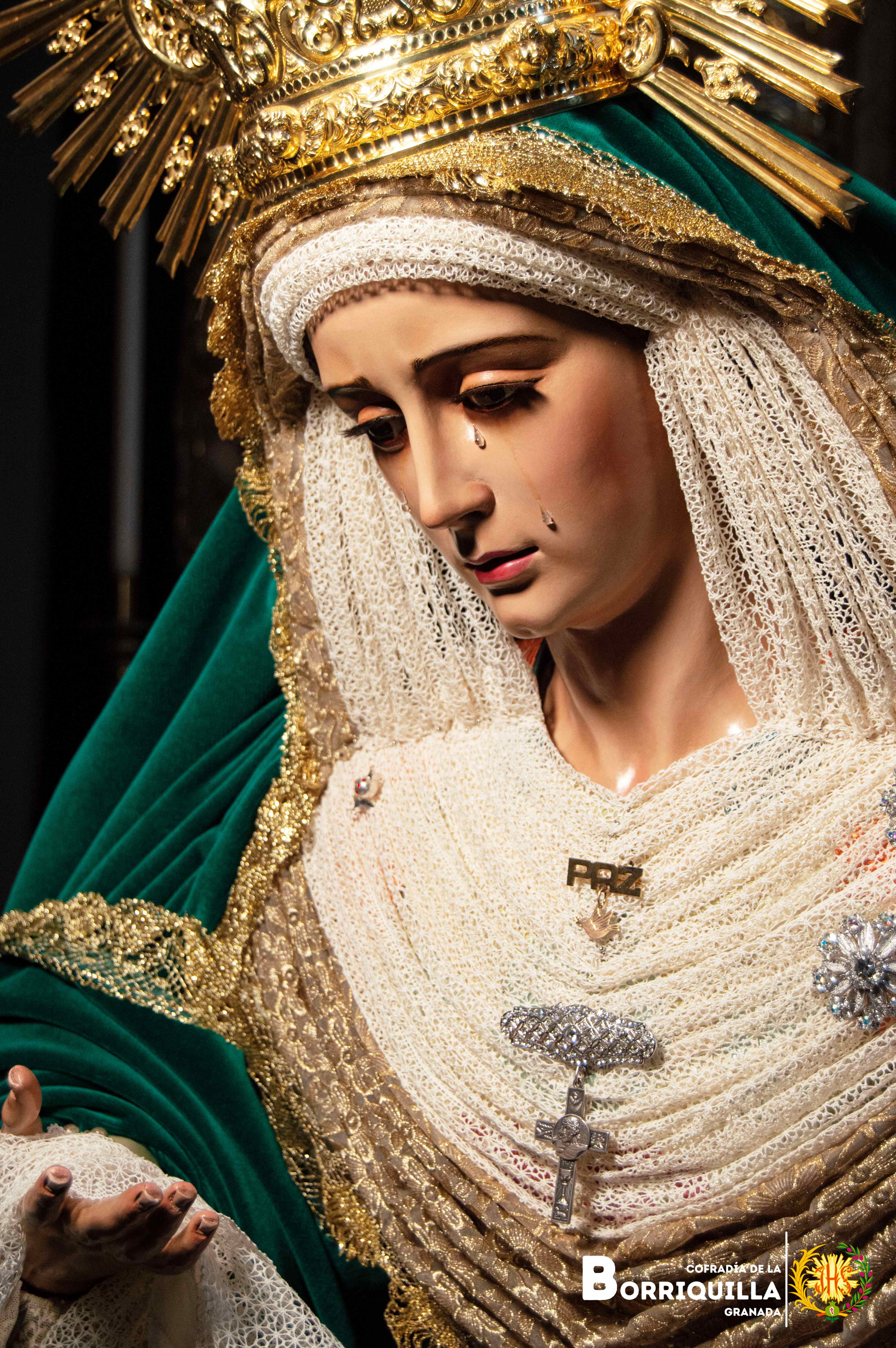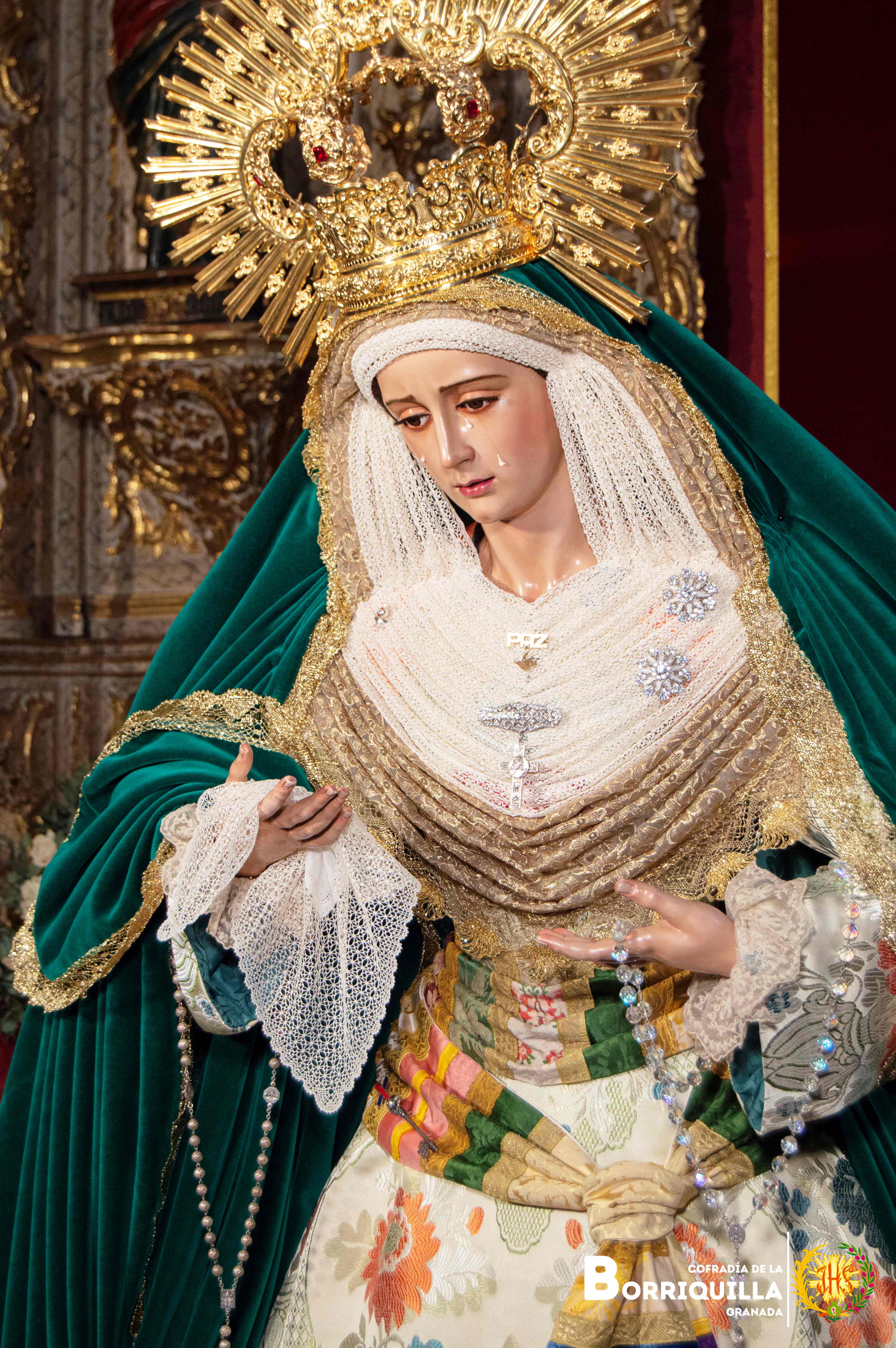 Así luce Ntra. Sra. de la Paz para el tiempo estival. Luce saya de brocado valenciano, manto de terciopelo verde, tocado elaborado con un encaje de bolillos y encaje dorado. Luce la corona de capilla de 2018.