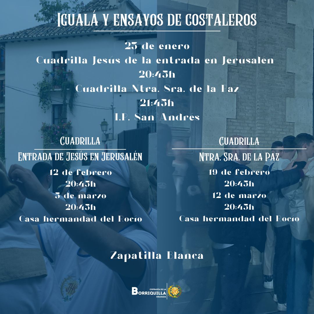 Se convoca al cuerpo de costaleros de Jesús de la Entrada en Jerusalén y Ntra. Sra. de la Paz. Se ruega puntualidad, zapatilla blanca y costal.