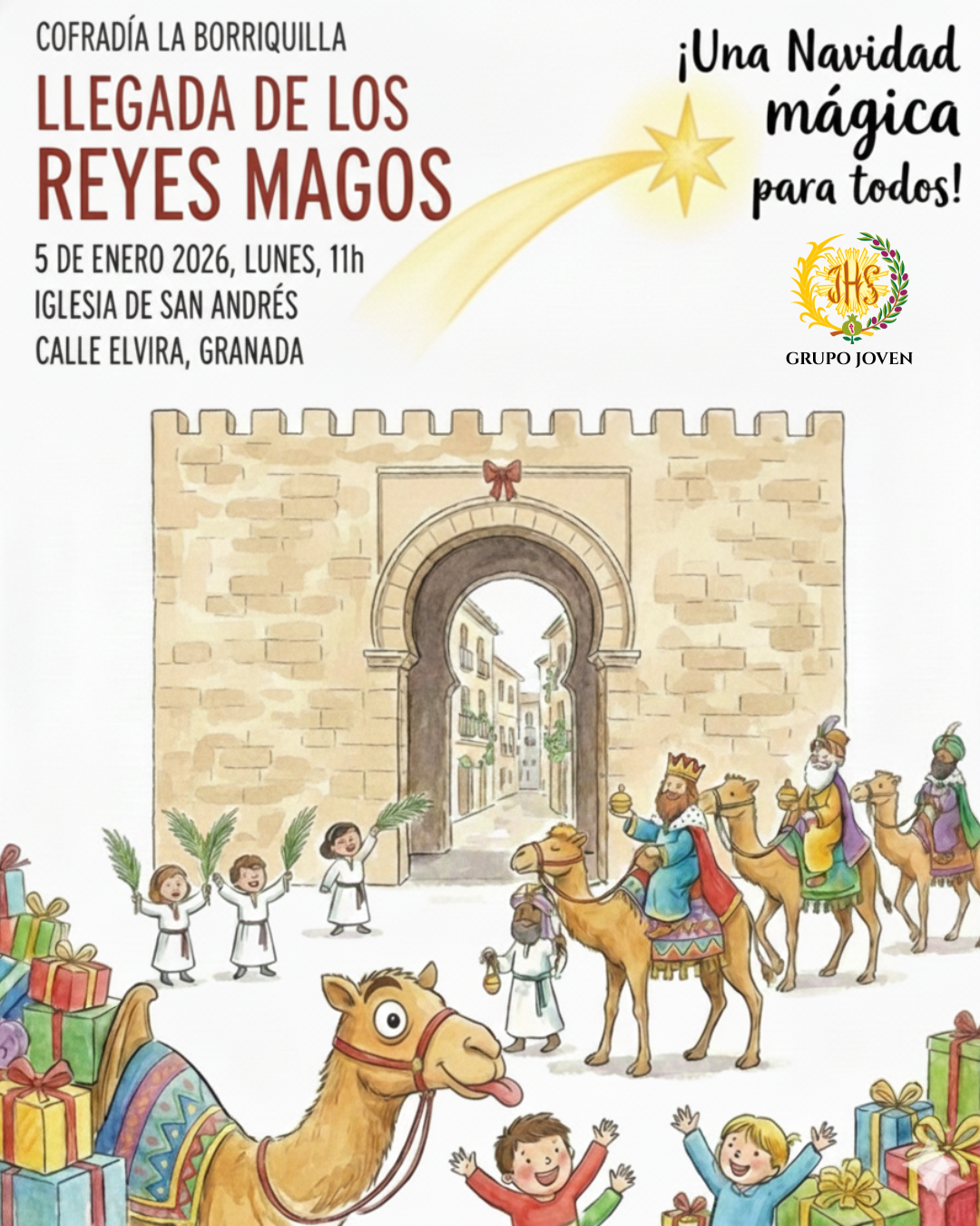 La visita de los Reyes Magos tendrá lugar el 5 de enero de 2026, a las 11:00 horas (se cambia la visita a las 18h por el tiempo que ha provocado la modificación de la cabalgata de los reyes magos en Granada), en la Parroquia de San Andrés Apóstol. Os animamos a vivir desde primera hora de la mañana el Día de Reyes junto a la Cofradía y a continuar la jornada acompañando a nuestra carroza de la Borriquilla en la Cabalgata organizada por el Ayuntamiento de Granada.