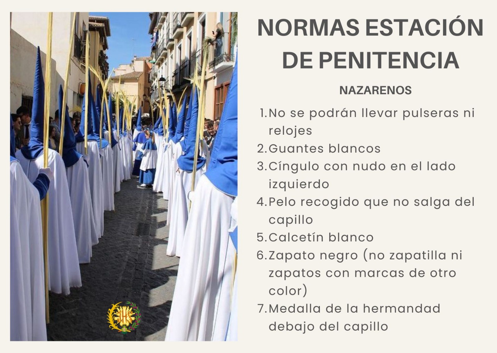 En este enlace puedes leerlas también con detalle https://www.borriquilla.es/normas-para-la-estacion-de-penitencia