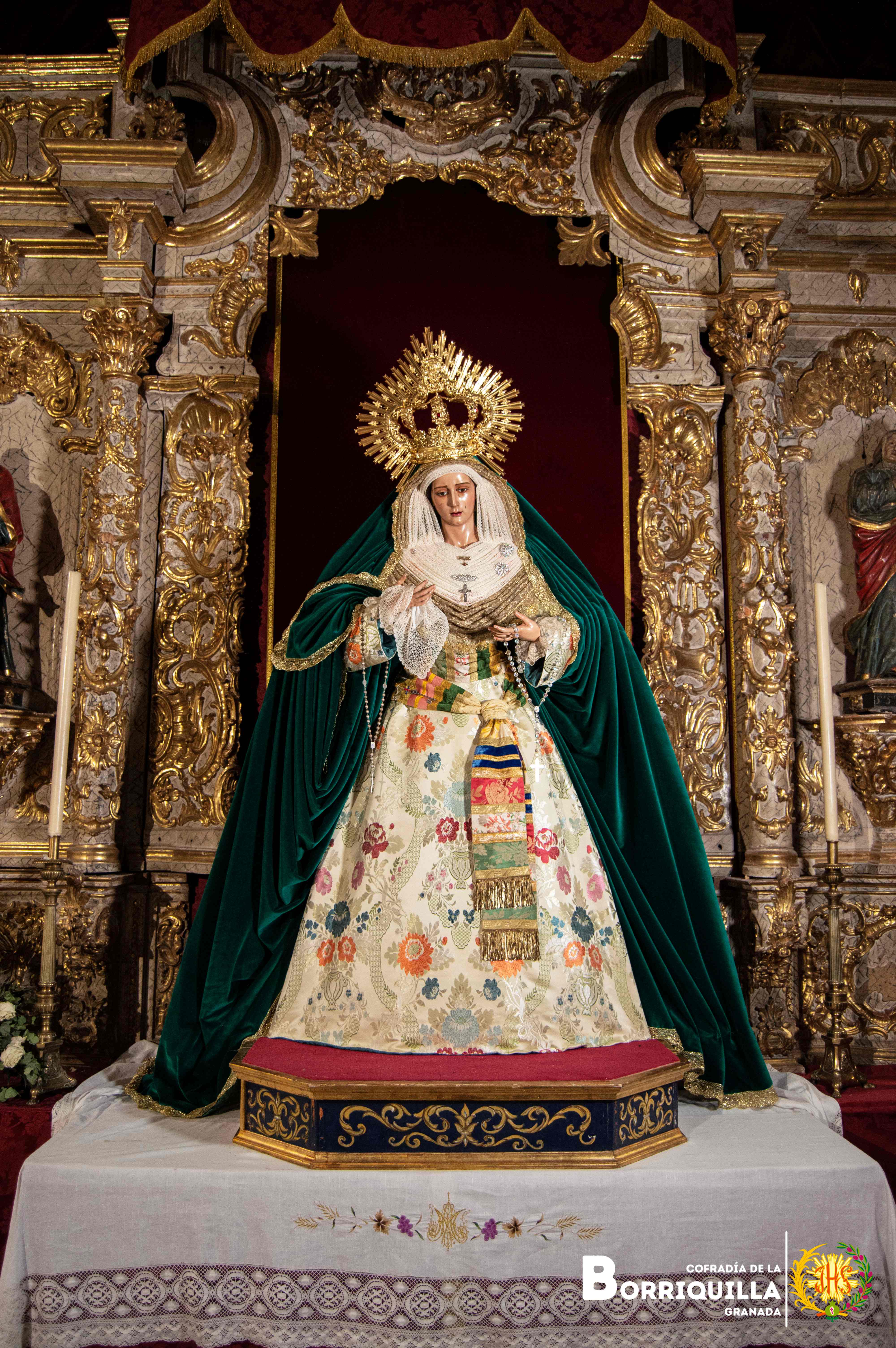 Así luce Ntra. Sra. de la Paz para el tiempo estival. Luce saya de brocado valenciano, manto de terciopelo verde, tocado elaborado con un encaje de bolillos y encaje dorado. Luce la corona de capilla de 2018.