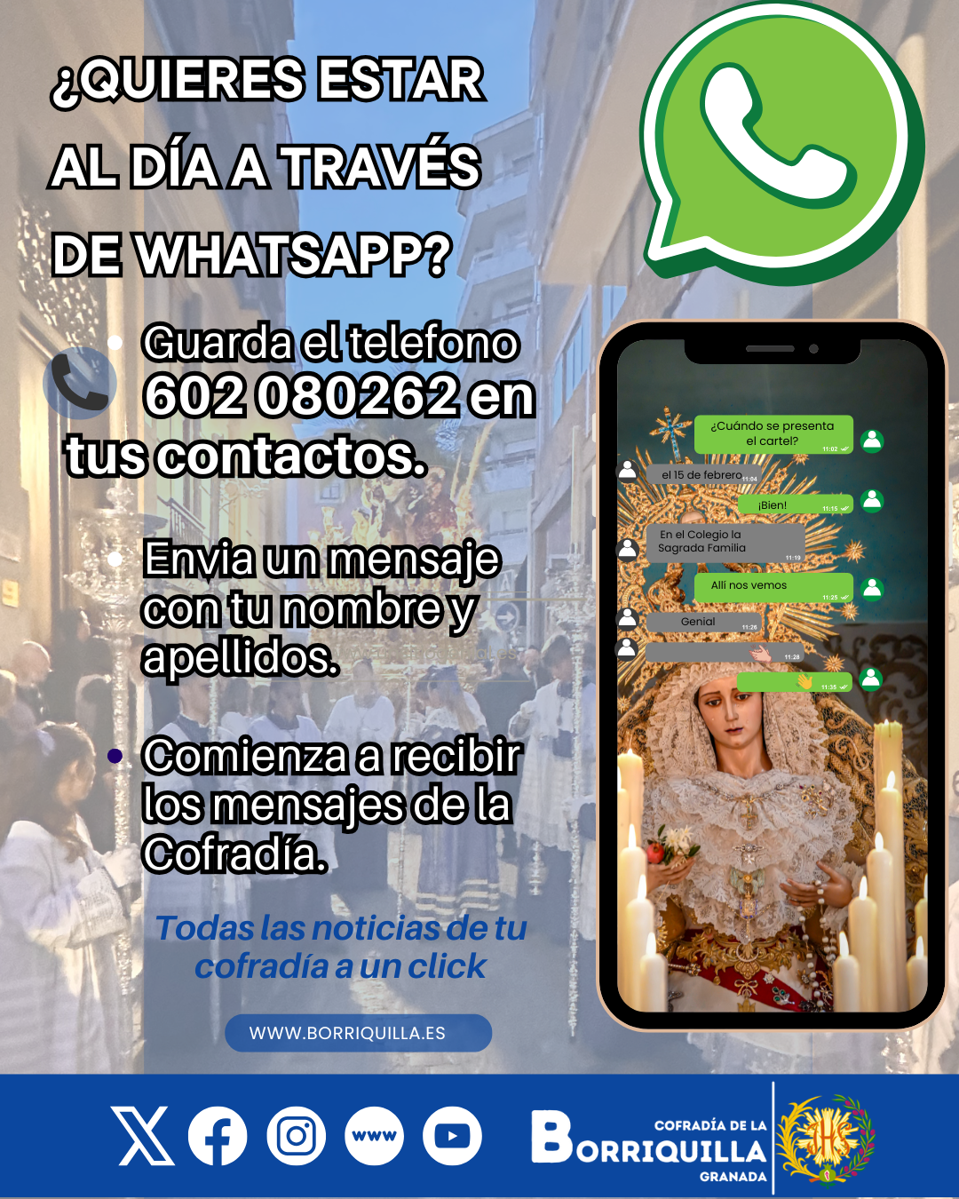 La Cofradía de la Borriquilla ha habilitado un nuevo número de WhatsApp para mantener informados a todos sus hermanos y devotos sobre las últimas noticias y actividades.