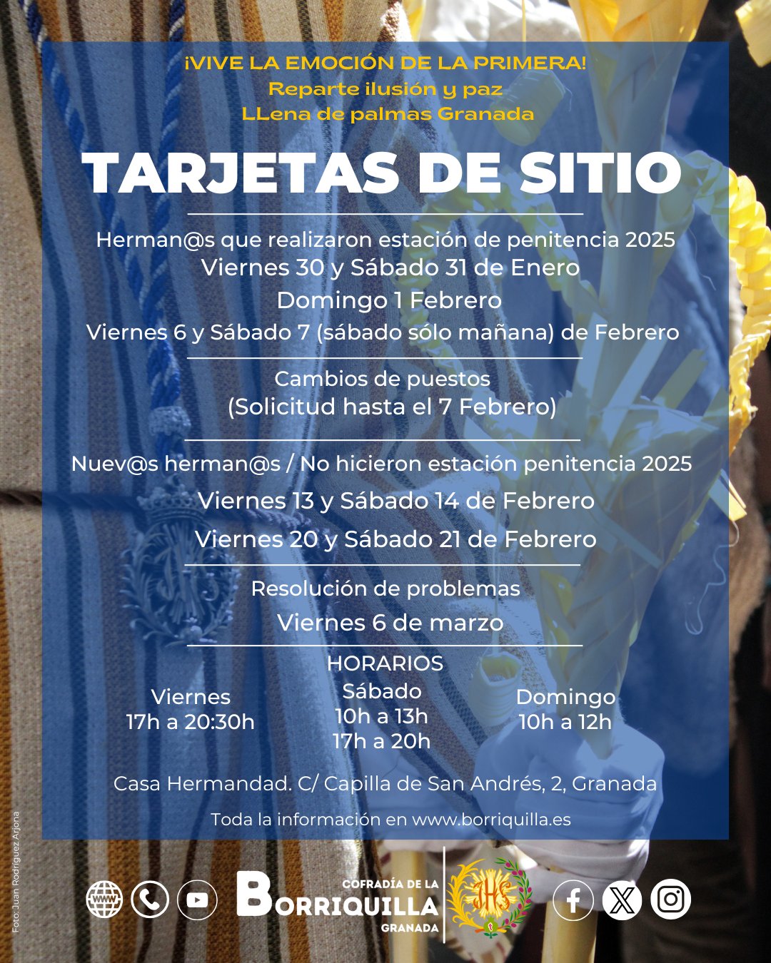 La Ilustre Cofradía de la Entrada de Jesús en Jerusalén y Nuestra Señora de la Paz comunica que el reparto de tarjetas de sitio y entrega de hábitos para la Estación de Penitencia del Domingo de Ramos de 2026, tendrá lugar en el mes de Febrero, en la Casa de Hermandad de la cofradía, sita en Calle Capilla de San Andrés, nº 2, Granada, concretamente: