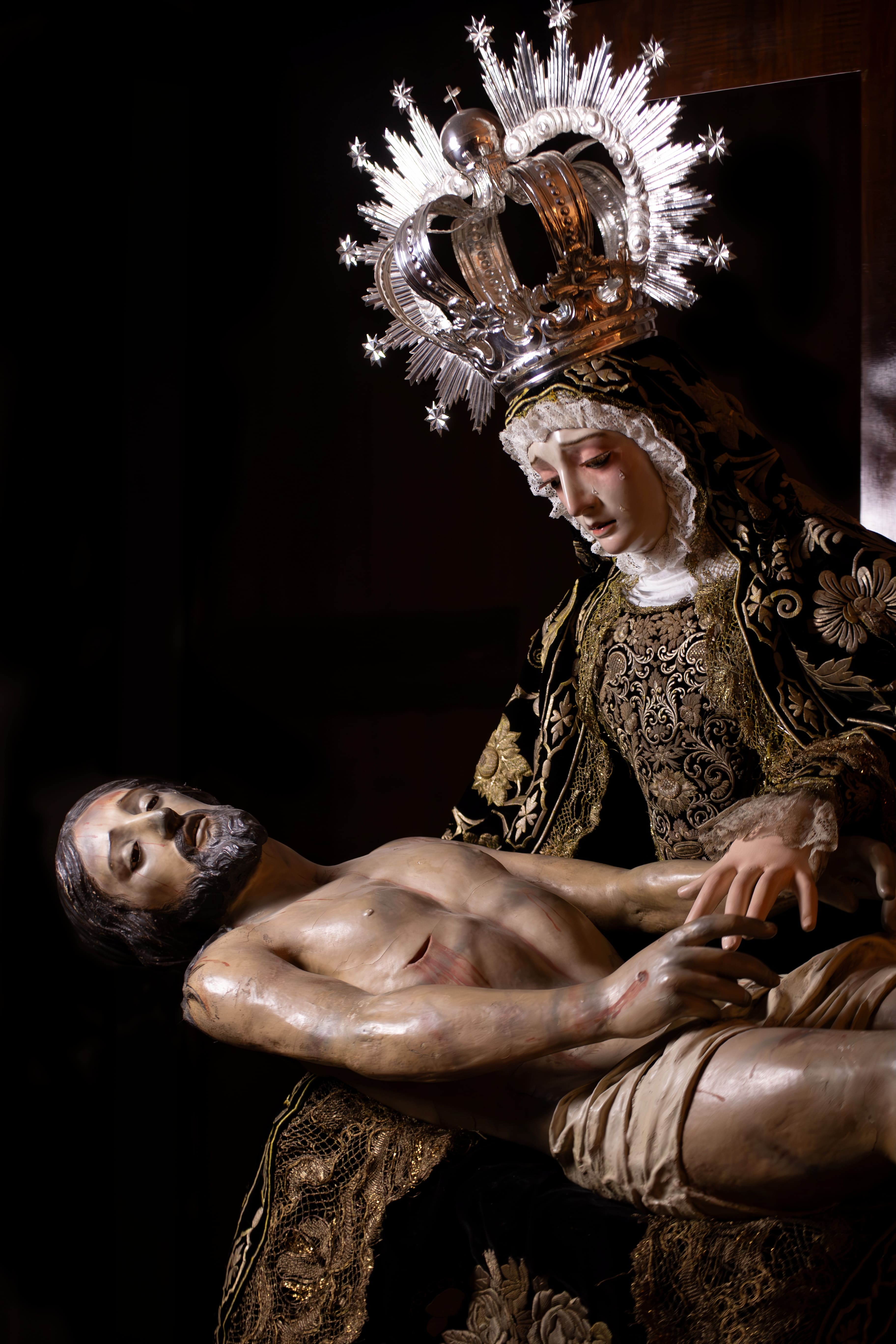 Para esta ocasión, la imagen ha sido ataviada por el vestidor Jorge Heredia, presentándose con una estética de profundo carácter historicista que recrea los modos en los que procesionó en el Santo Entierro Antológico de 1913. La Santísima Virgen luce el manto ajustado a la cabeza, configurando una silueta recogida y sobrecogedora, acompañado de un rostrillo de corte monjil elaborado con fino encaje, que enmarca el semblante doloroso de la imagen con sobriedad y elegancia. Completa el conjunto su terno de terciopelo negro bordado en oro, de gran riqueza y solemnidad. Todo ello conforma una estampa de gran fuerza devocional que conecta directamente con la tradición histórica de la corporación.