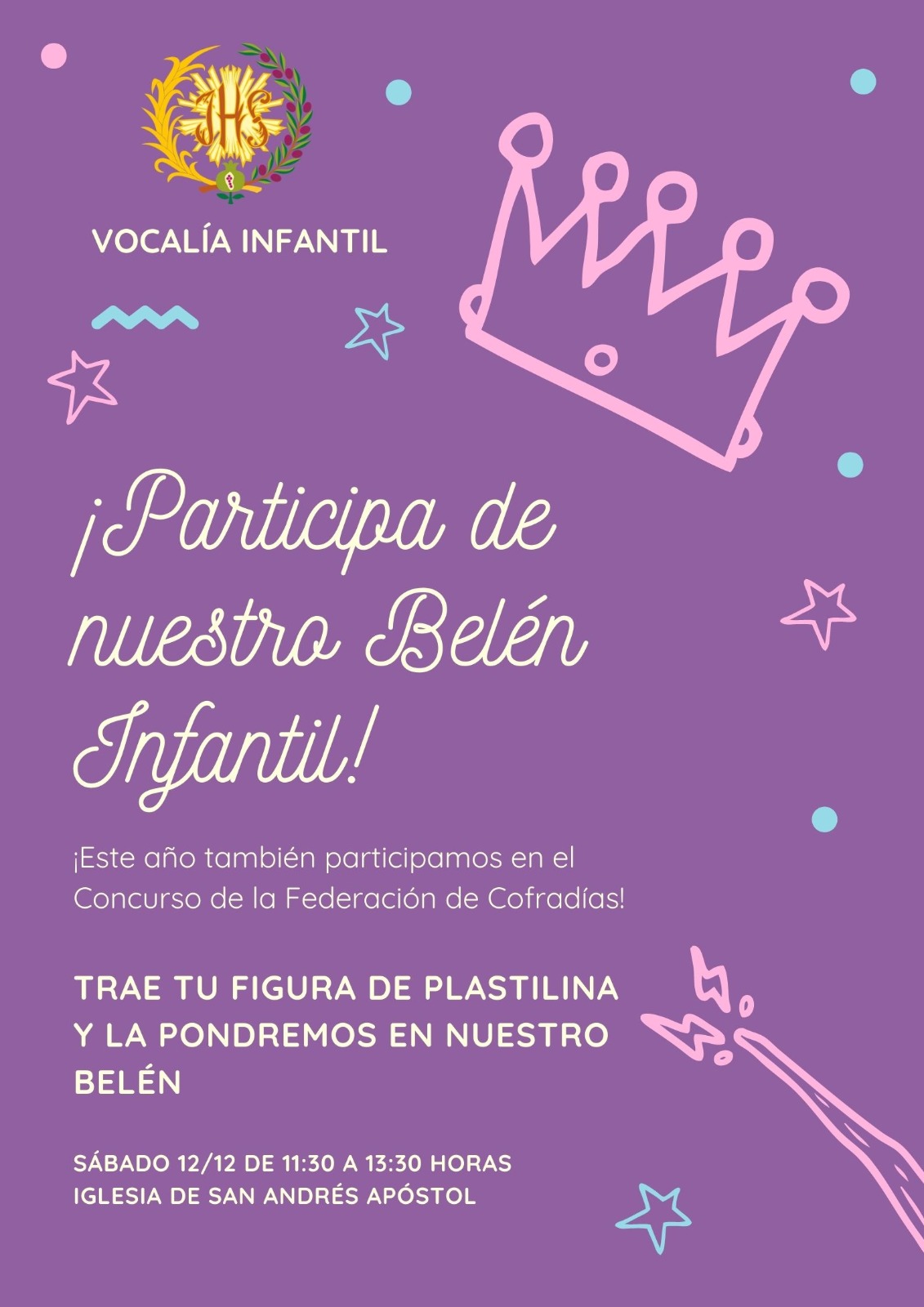 La Vocalía Infantil y el Grupo Joven está planteando y preparando la base del belén, y os invitamos a vosotros, a los niños y las niñas que preparéis alguna figura de plastilina y la traigáis a la Iglesia de San Andrés el próximo sábado día 12 de diciembre de 11:30h a 13:30h para ponerla en el belén.