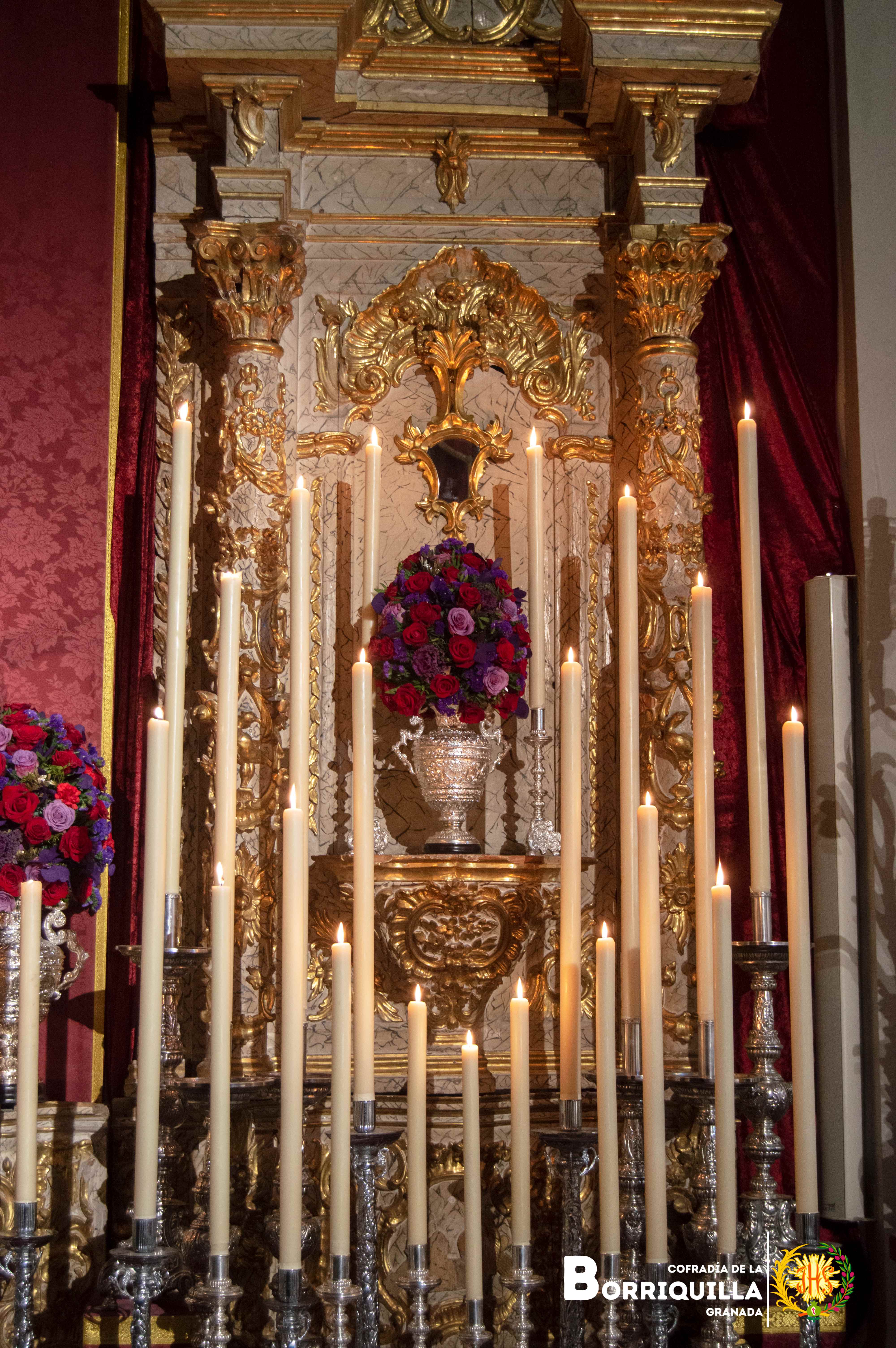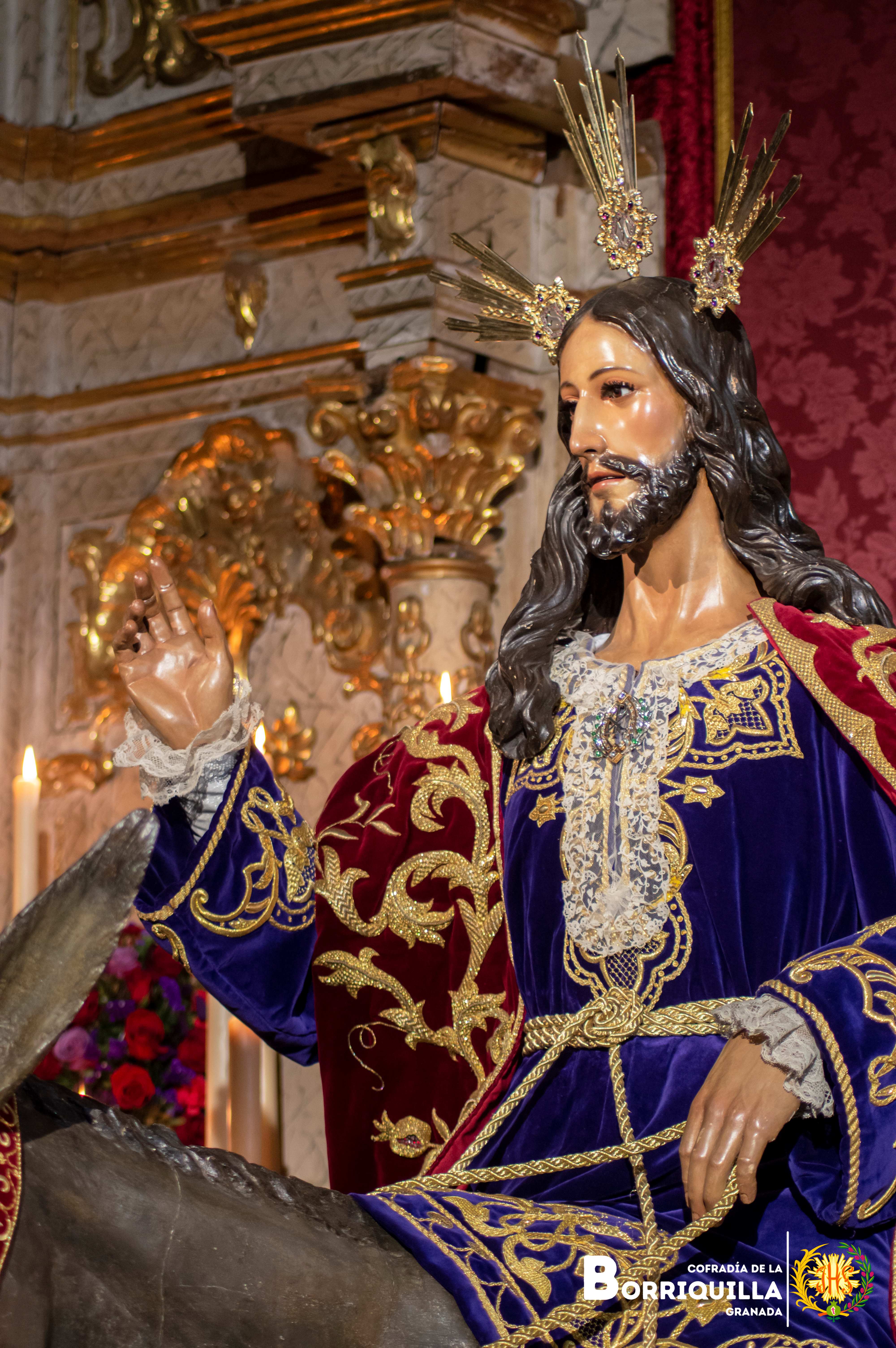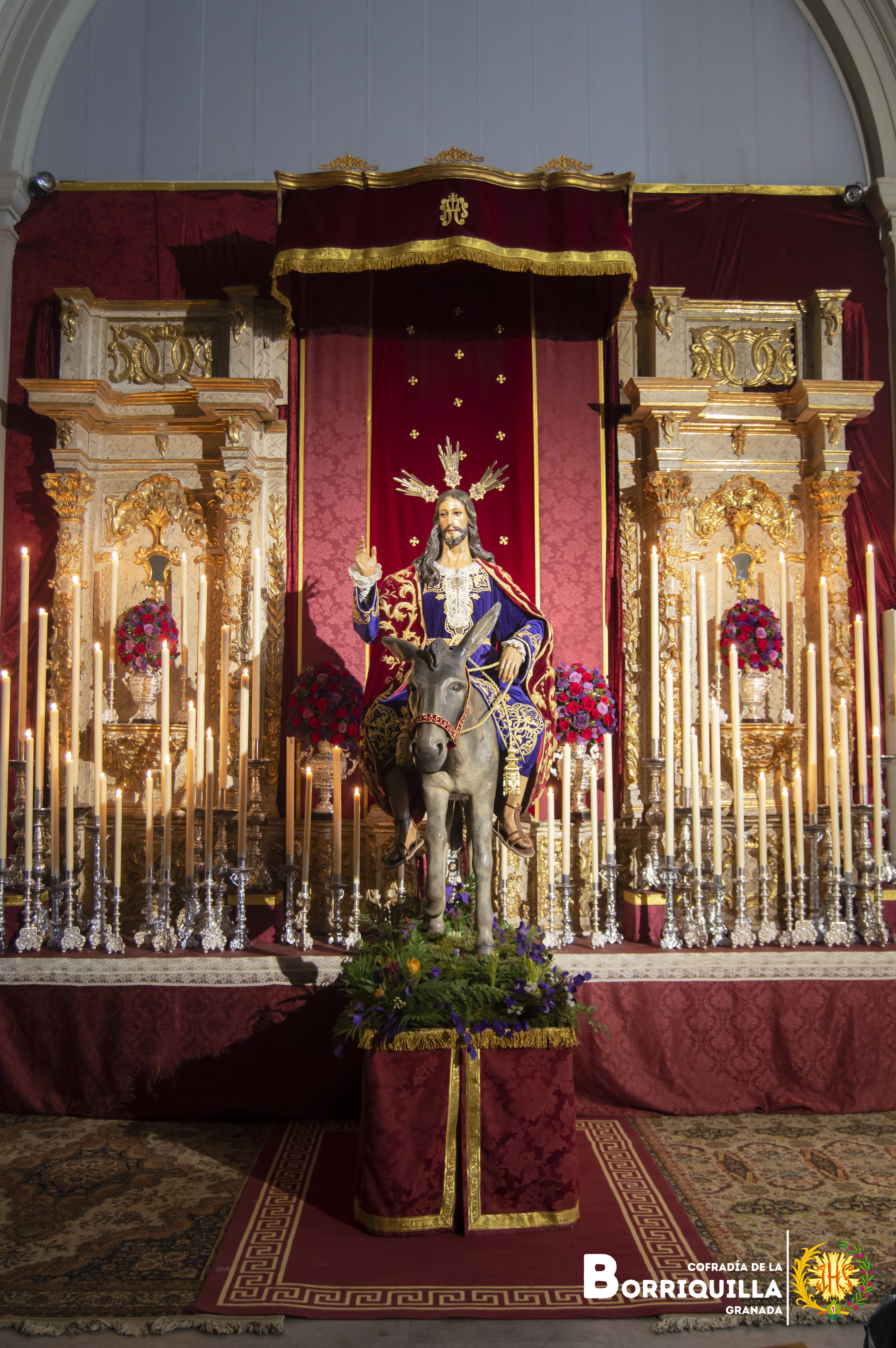 Así se presenta Jesús en la entrada en Jerusalén en su altar efímero para los cultos que celebramos en honor a Cristo Rey. El altar está compuesto con elementos de un antiguo retablo que acogía la imagen de San Andrés que se situaba en la nave de la epístola de la I.P. de San Andrés. Parte de la candelería ha sido cedida por la Hermandad del Rescate para tal ocasión. Las jarras de flores están compuestas por multitud de flores en tonos rojos y morados.