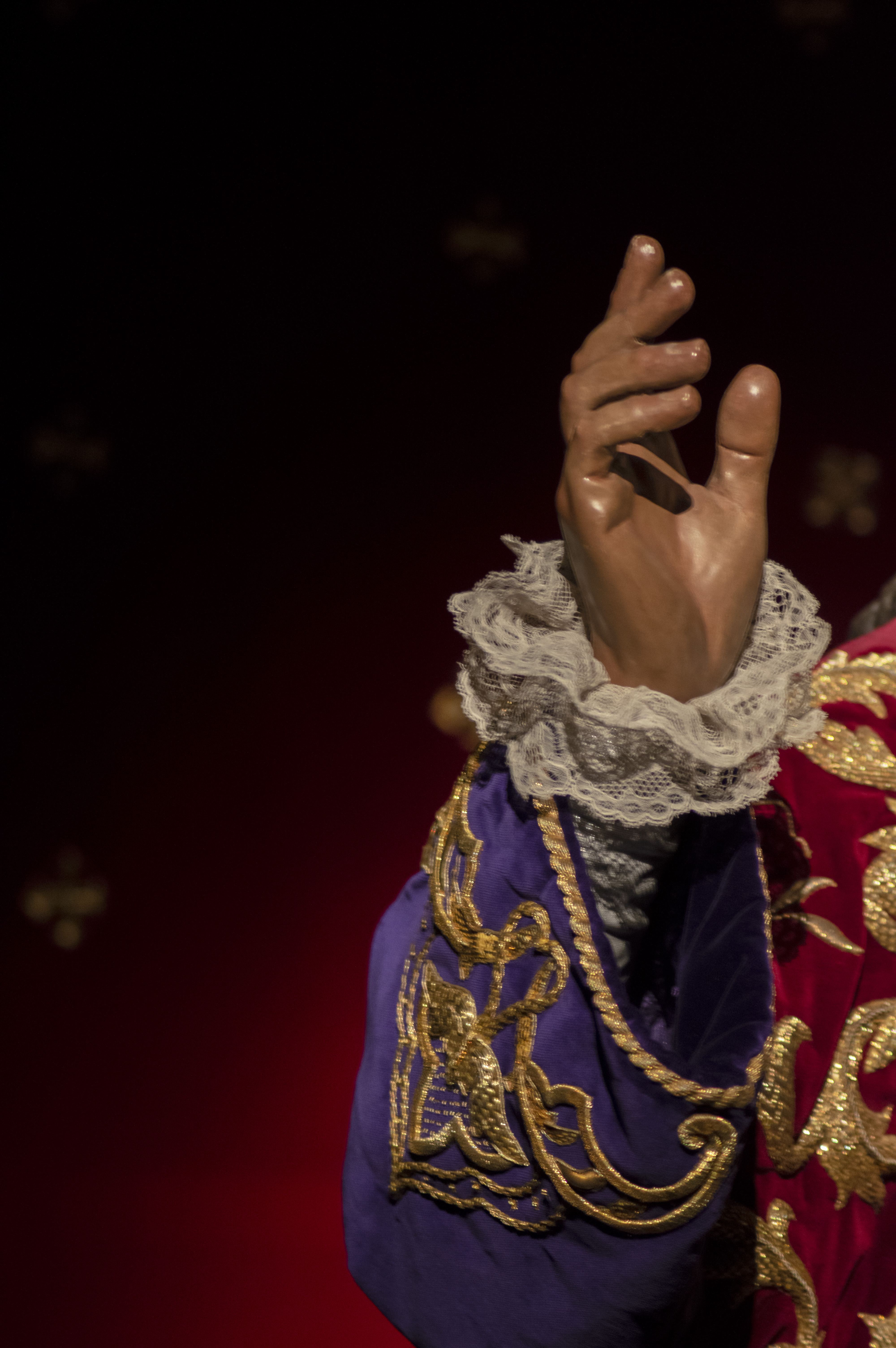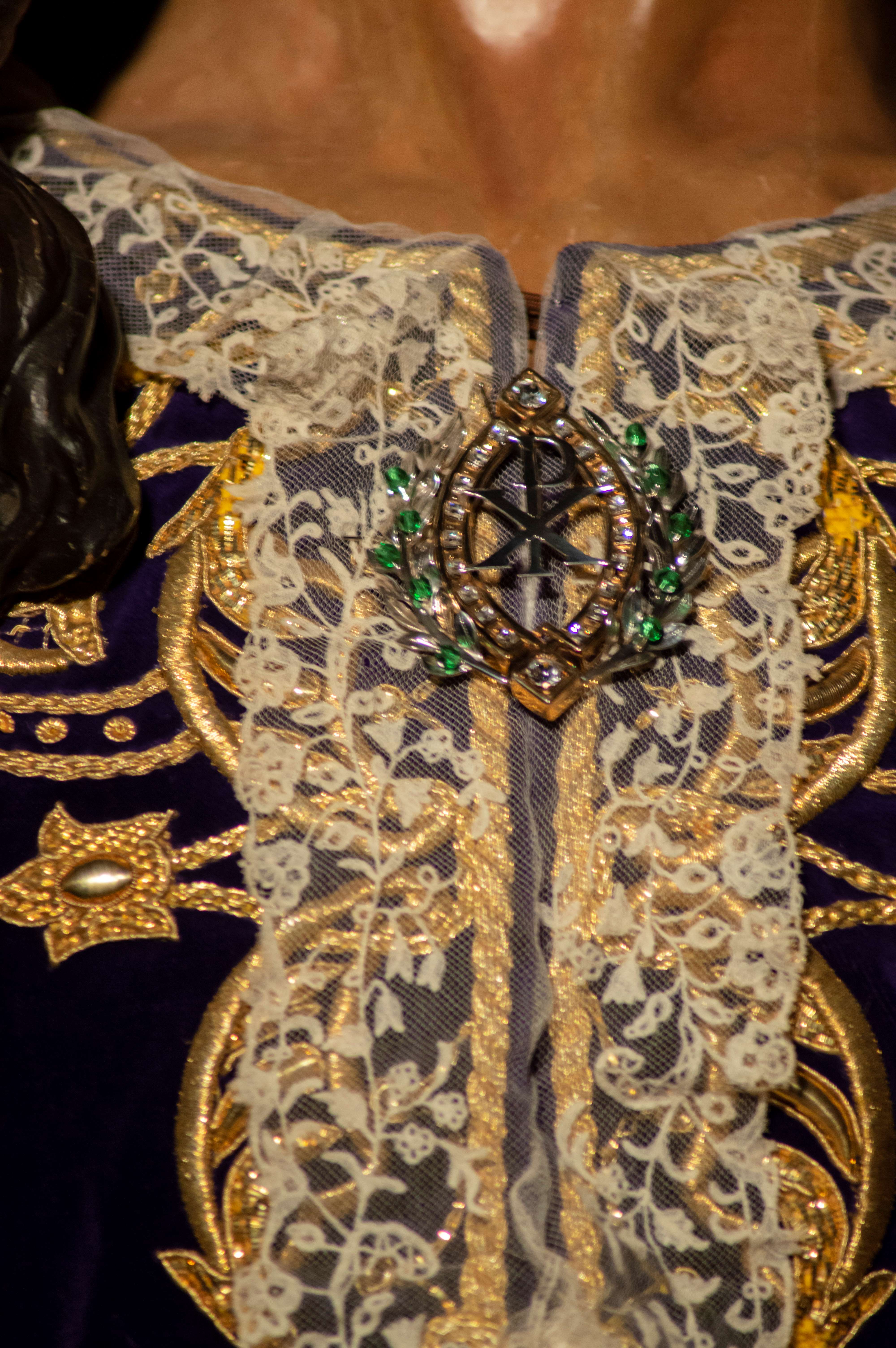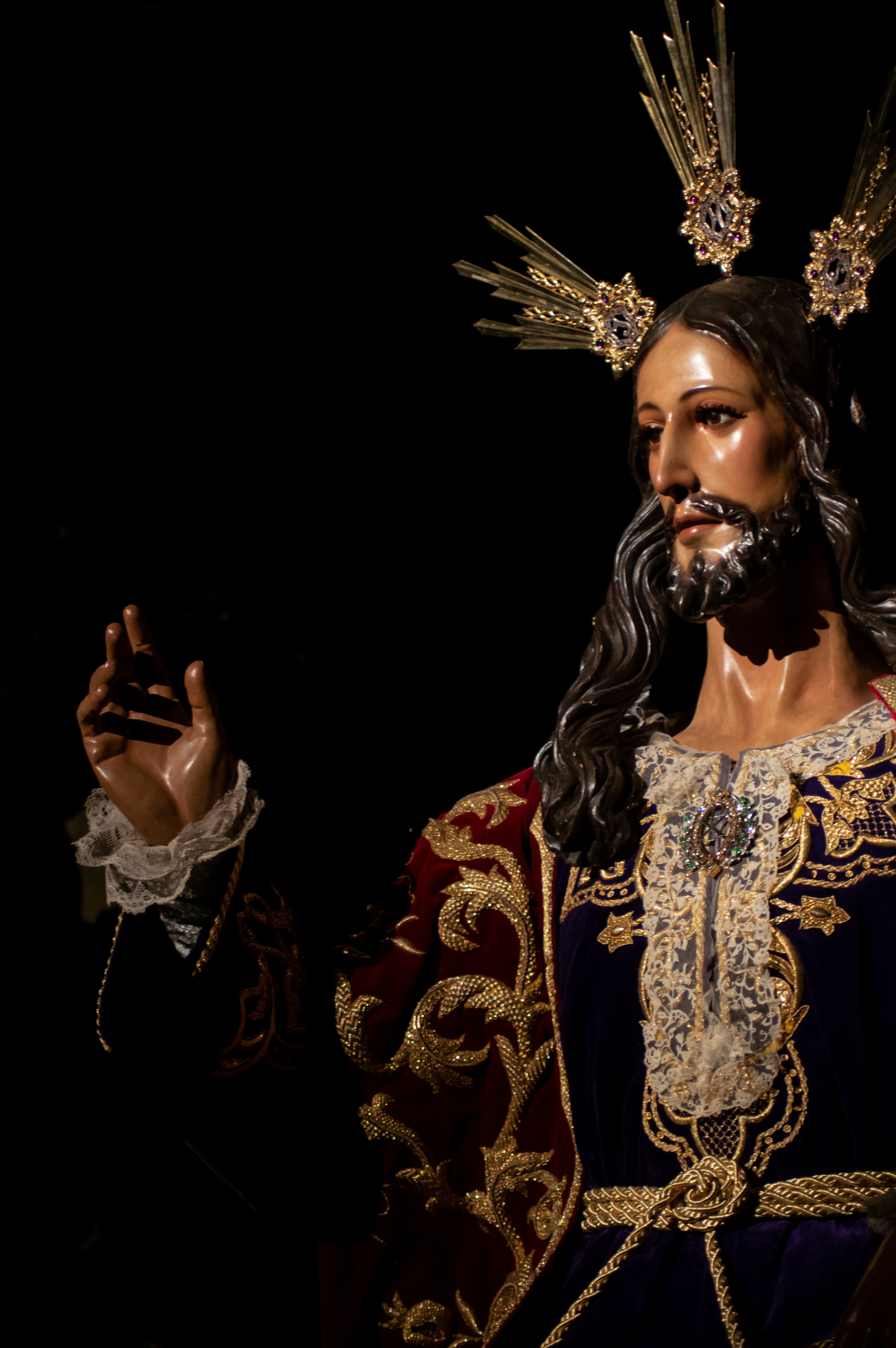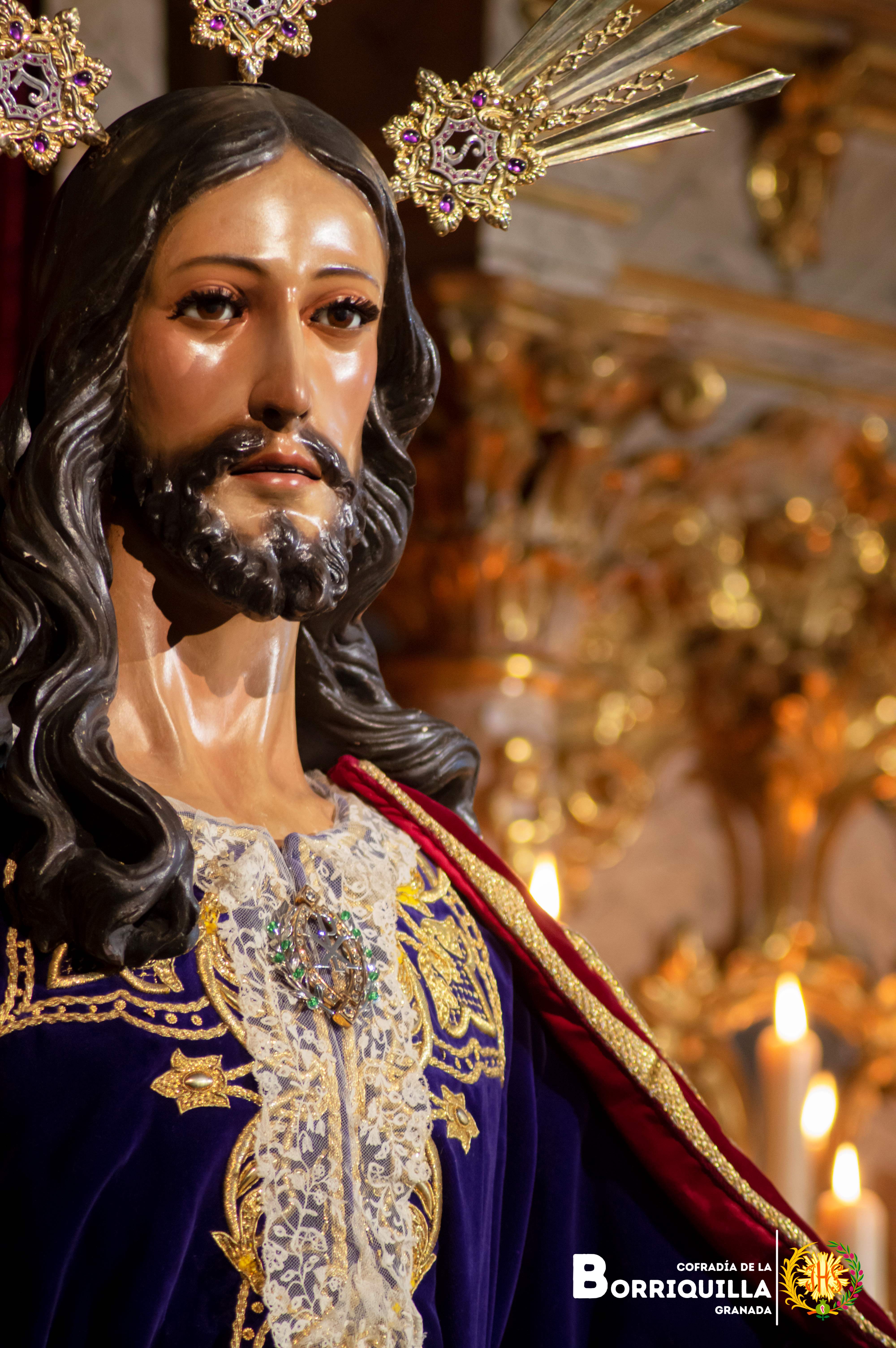 Así se presenta Jesús en la entrada en Jerusalén en su altar efímero para los cultos que celebramos en honor a Cristo Rey. El altar está compuesto con elementos de un antiguo retablo que acogía la imagen de San Andrés que se situaba en la nave de la epístola de la I.P. de San Andrés. Parte de la candelería ha sido cedida por la Hermandad del Rescate para tal ocasión. Las jarras de flores están compuestas por multitud de flores en tonos rojos y morados.