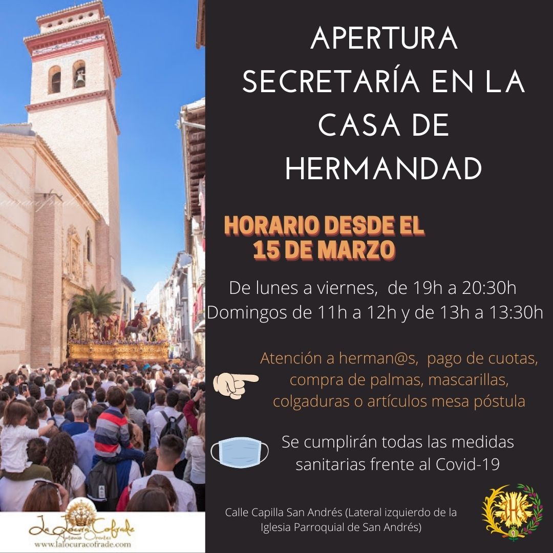 La secretaría de la casa de hermandad se abrirá a partir del 15 de marzo de lunes a viernes de 19:00 horas a 20:30h y los domingos de 11:00 horas a 12:00 horas y de 13:00 horas a 13:30 horas.