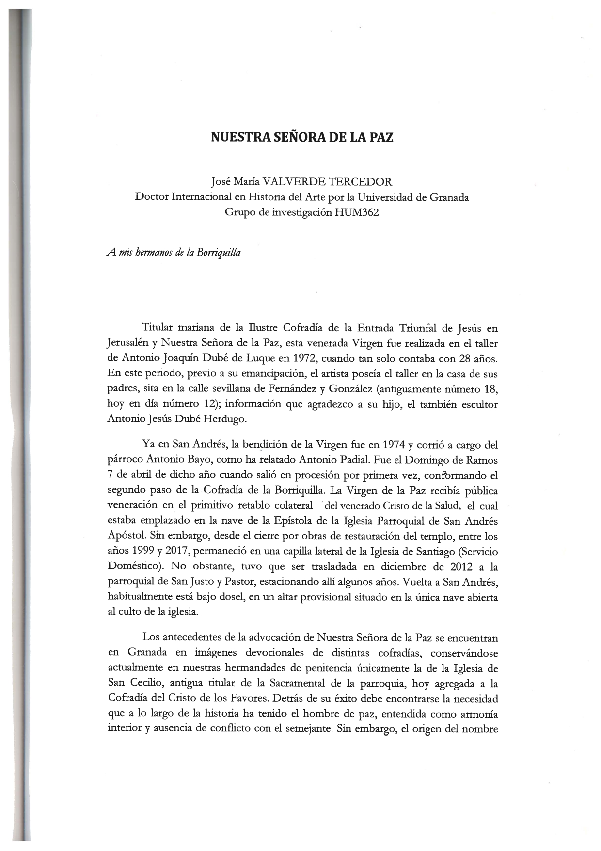 Nuestro Hermano Jose María Valverde ha sido uno de los coordinadores del libro Stabat Mater Granatensis, en dónde escribe un artículo sobre Nuestra Señora de la Paz. Dicho artículo lo dedica a todos los hermanos de la Borriquilla.