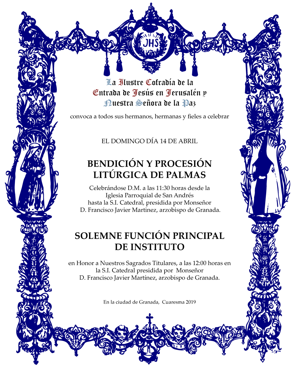 La Procesión litúrgica de Palmas de la Diócesis de Granada de la Santa Iglesia Catedral del Domingo de Ramos se realizará, otro año más, desde la sede de la Cofradía, la Iglesia Parroquial de San Andrés Apóstol.
