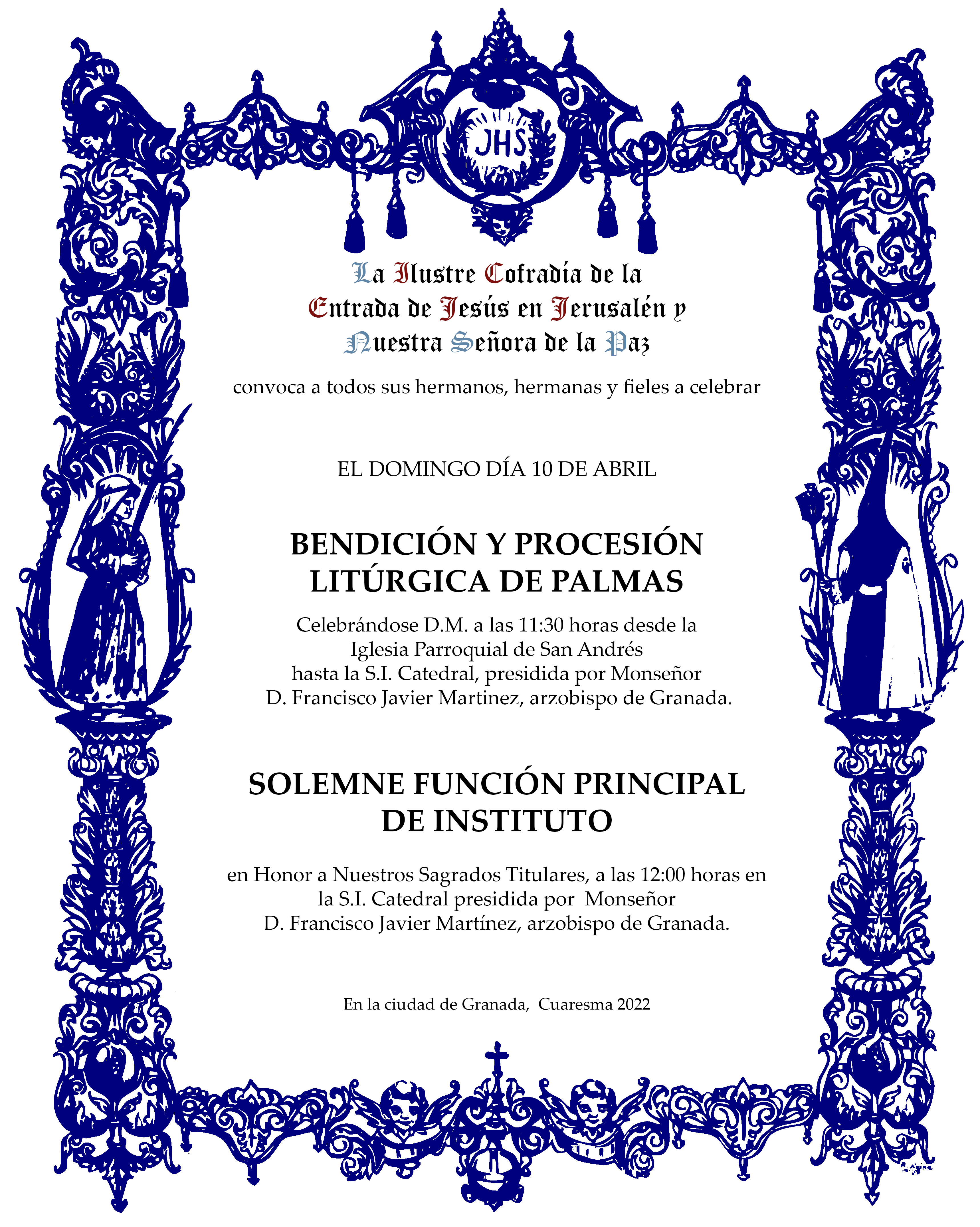 La Procesión litúrgica de Palmas de la Diócesis de Granada de la Santa Iglesia Catedral del Domingo de Ramos se realizará, otro año más, desde la sede de la Cofradía, la Iglesia Parroquial de San Andrés Apóstol.
