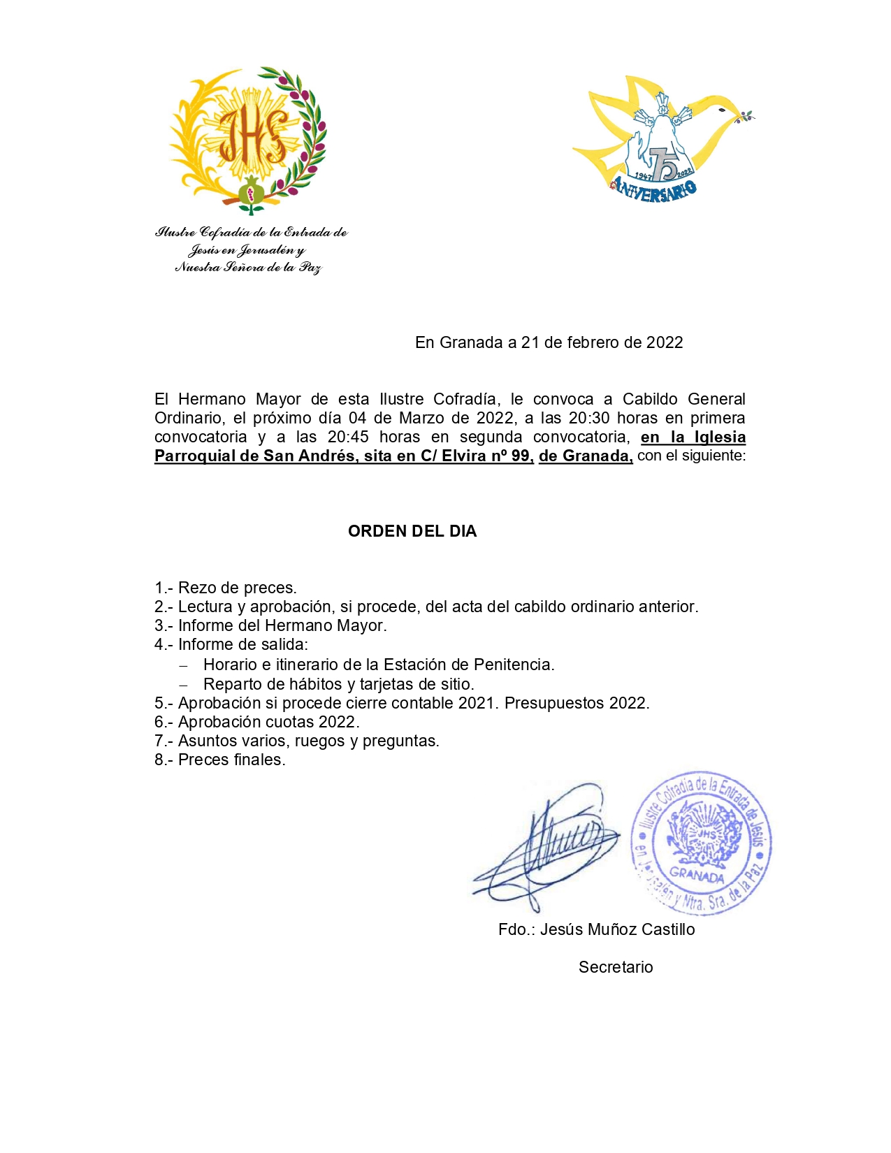 Se convoca a todos los hermanos y hermanas a cabildo general ordinario a celebrar el próximo día 4 de marzo en la Iglesia Parroquial de San Andrés.