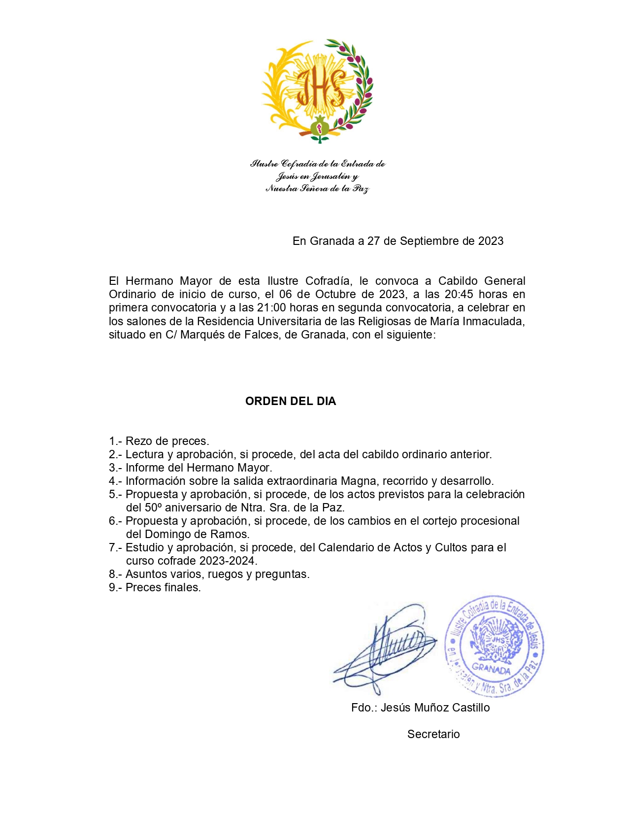 Os informamos y convocamos a cabildo ordinario de Hermanos de la Ilustre Cofradía de la Entrada de Jesús en Jerusalén y Ntra. Sra. de la Paz, que se celebrará el viernes, día 06 de octubre del 2023, en los Salones de la Residencia Universitaria de las Religiosas de María Inmaculada, C/ Marqués de Falces, a las 20:45 horas en primera convocatoria y a las 21:00 horas en segunda convocatoria.