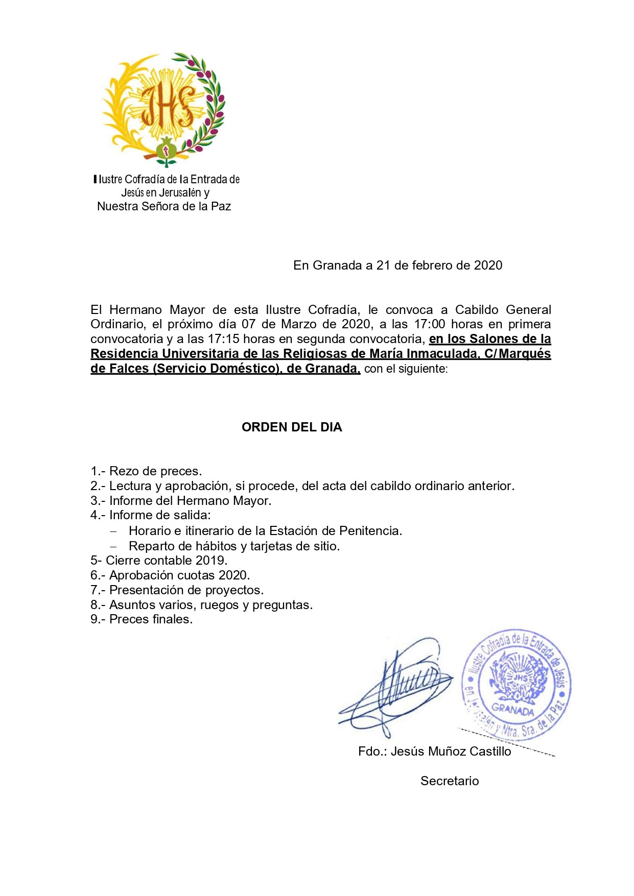 El Hermano Mayor de esta Ilustre Cofradía, le convoca a Cabildo General Ordinario, el próximo día 07 de Marzo de 2020, a las 17:00 horas en primera convocatoria y a las 17:15 horas en segunda convocatoria, en los Salones de la Residencia Universitaria de las Religiosas de María Inmaculada, C/ Marqués de Falces (Servicio Doméstico), de Granada, con el siguiente: