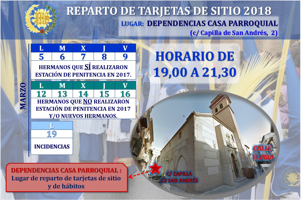 A partir de hoy lunes, 5 de marzo, y hasta el viernes, 9 de marzo, los hermanos que realizaron Estación de Penitencia en 2017 podrán retirar su tarjeta de sitio en las dependencias parroquiales de San Andrés en horario de 19 a 21,30h.