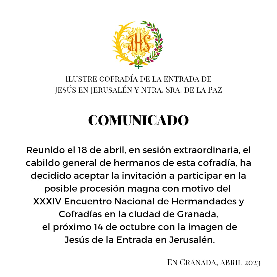 El cabildo de hermanos, en sesión extraordinaria, ha decidido aceptar la invitación a la posible procesión magna con motivo del XXXIV Encuentro Nacional de Hermandades y Cofradías que se desarrollaría el próximo 14 de octubre de 2023 con la imagen de Jesús de la entrada en Jerusalén. Tras el cabildo del pasado 24 de febrero, en el que se debatió por los presentes la participación en dicho acto, los pros y los contras, el propio cabildo de hermanos decidió posponer la votación de dicha participación para después de semana santa y que puedan asistir más hermanos para la votación.