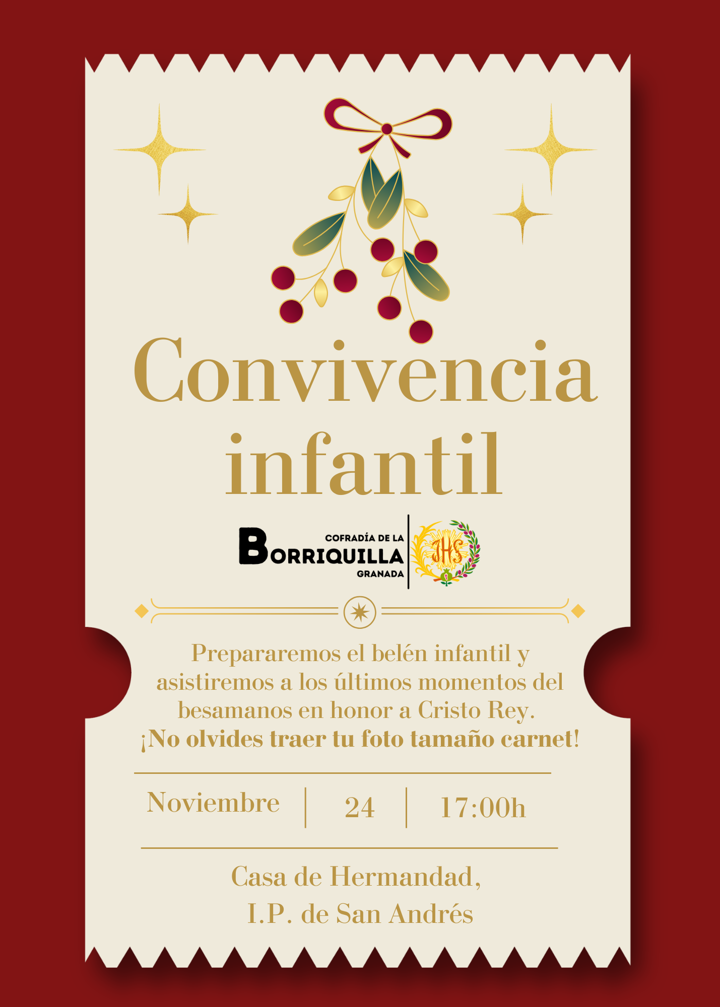 La vocalía de Infantil convoca a todos los peques (hasta los 12 años) a la convivencia que vamos a tener el domingo 24 de noviembre para preparar el belén infantil de la cofradía, hacer postal para el concurso de postales y vivir juntos los últimos momentos del besamanos del Señor por su Festividad de Cristo Rey.