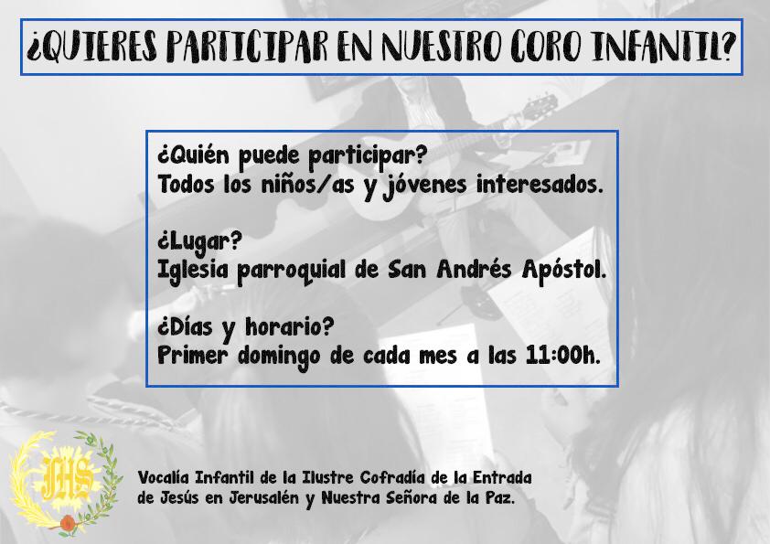 Recordamos que antes de los cultos, el Coro Infantil de la Borriquilla ensayará el repertorio musical que acompañará la celebración de nuestros cultos. Animamos a todos los niños y las niñas que deseen participar a que vengan a la parroquia a las 11h de la mañana. No es necesario tener conocimientos musicales, la idea es que nuestros niños/as y jóvenes puedan participar de la vida cristiana en nuestros cultos a través de la música.