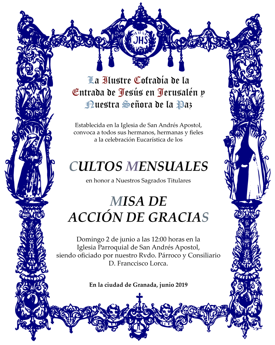 La Junta de Gobierno invita, a todos los hermanos, hermanas, amigos, amigas y simpatizantes, a los Cultos Mensuales en Honor a Nuestros Sagrados Titulares.