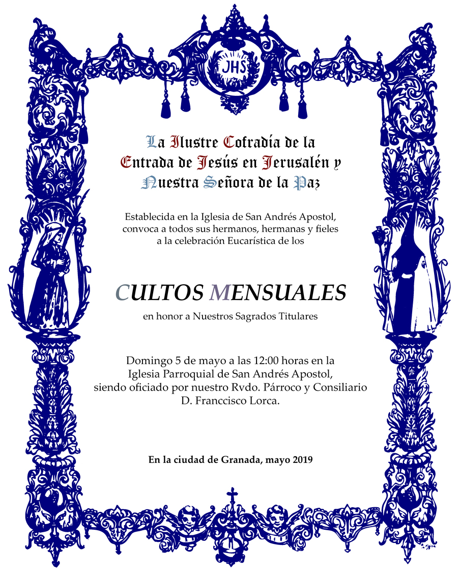 Se convoca a todos los hermanos, las hermanas y simpatizantes a los cultos mensuales del mes de mayo en honor a Nuestros Sagrados Titulares.