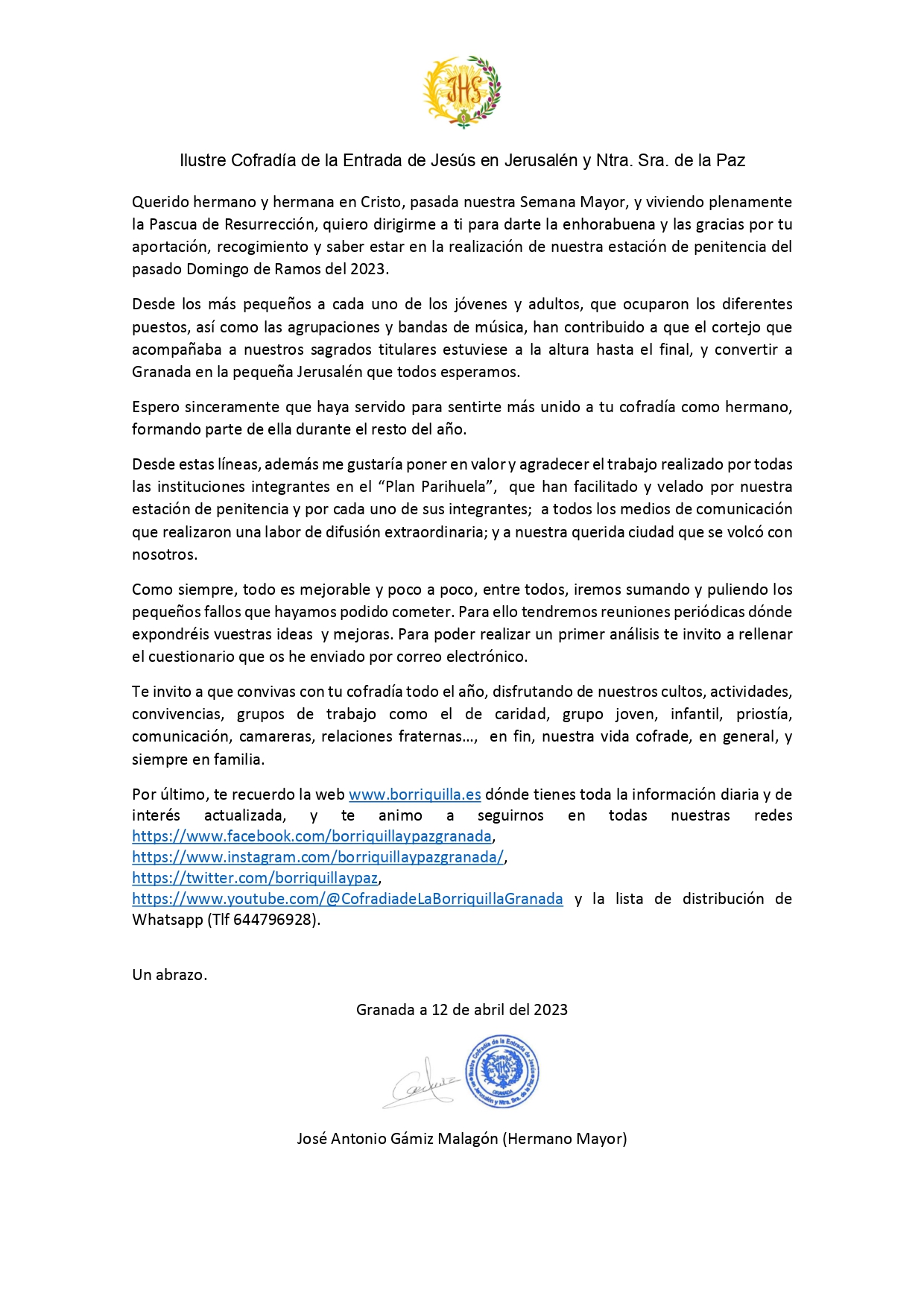 Por último, te recuerdo la web www.borriquilla.es dónde tienes toda la información diaria y de interés actualizada, y te animo a seguirnos en todas nuestras redes https://www.facebook.com/borriquillaypazgranada, https://www.instagram.com/borriquillaypazgranada/,