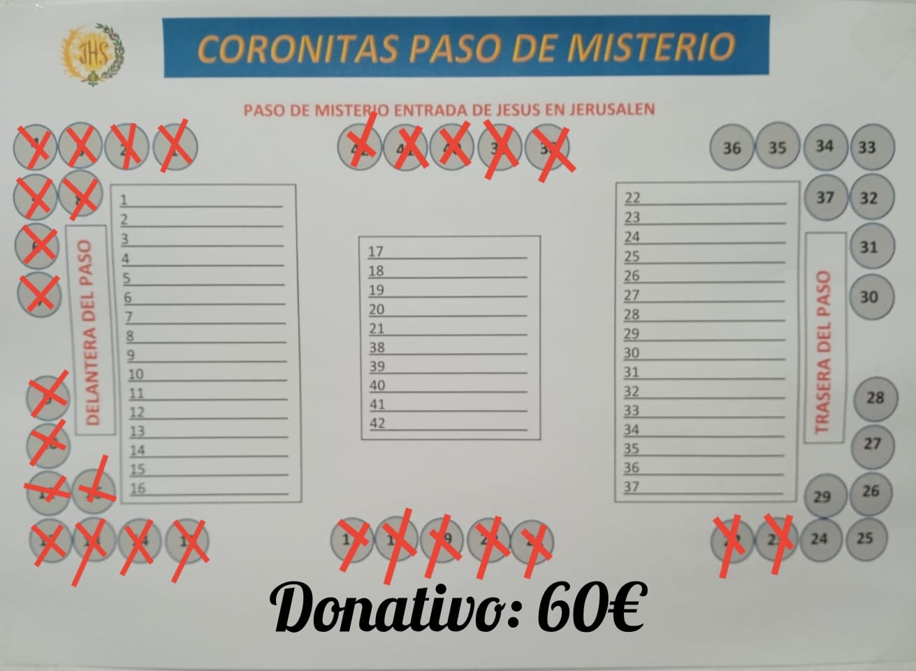 Para abordar este proyecto, la Junta de Gobierno, puso a disposición de todos los hermanos y las hermanas la posibilidad de donar una coronita de forma que el paso de misterio luzca con más fuerza tras el avance del dorado en el mismo.