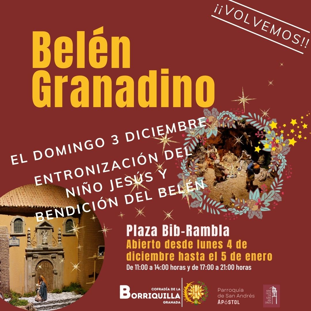 Mañana domingo, 3 de diciembre, tras los cultos mensuales nos desplazaremos a Plaza Bib-Rambla para la entronización del niño Jesús por el Decano del Colegio Of. Peritos e Ingenieros Técnicos Industriales de Granada D. Fernando Terrón, Hermano Honorario de la cofradía, y la bendición del belén por nuestro consiliario y párroco de la iglesia de San Andrés, D. Francisco Lorca.