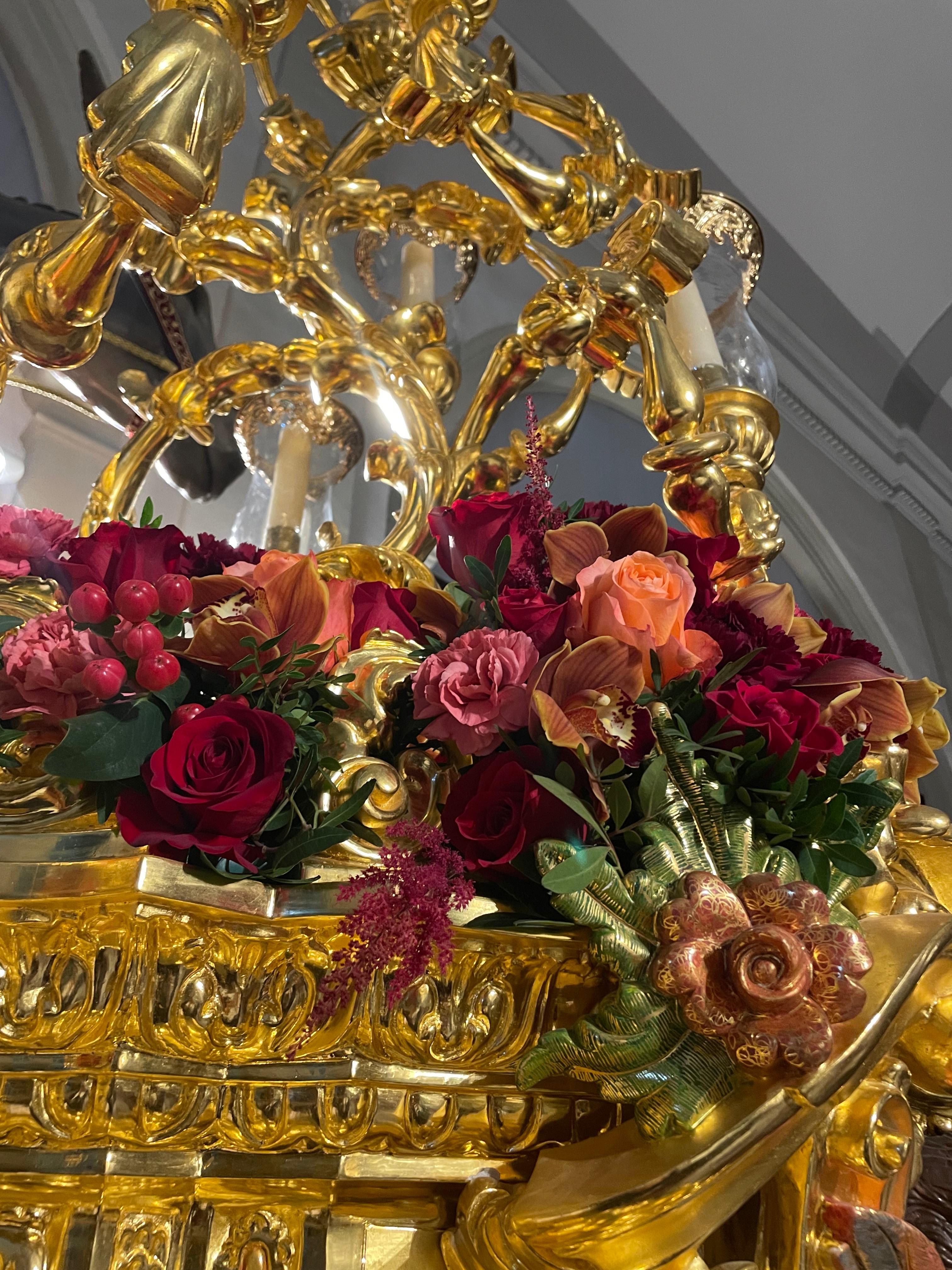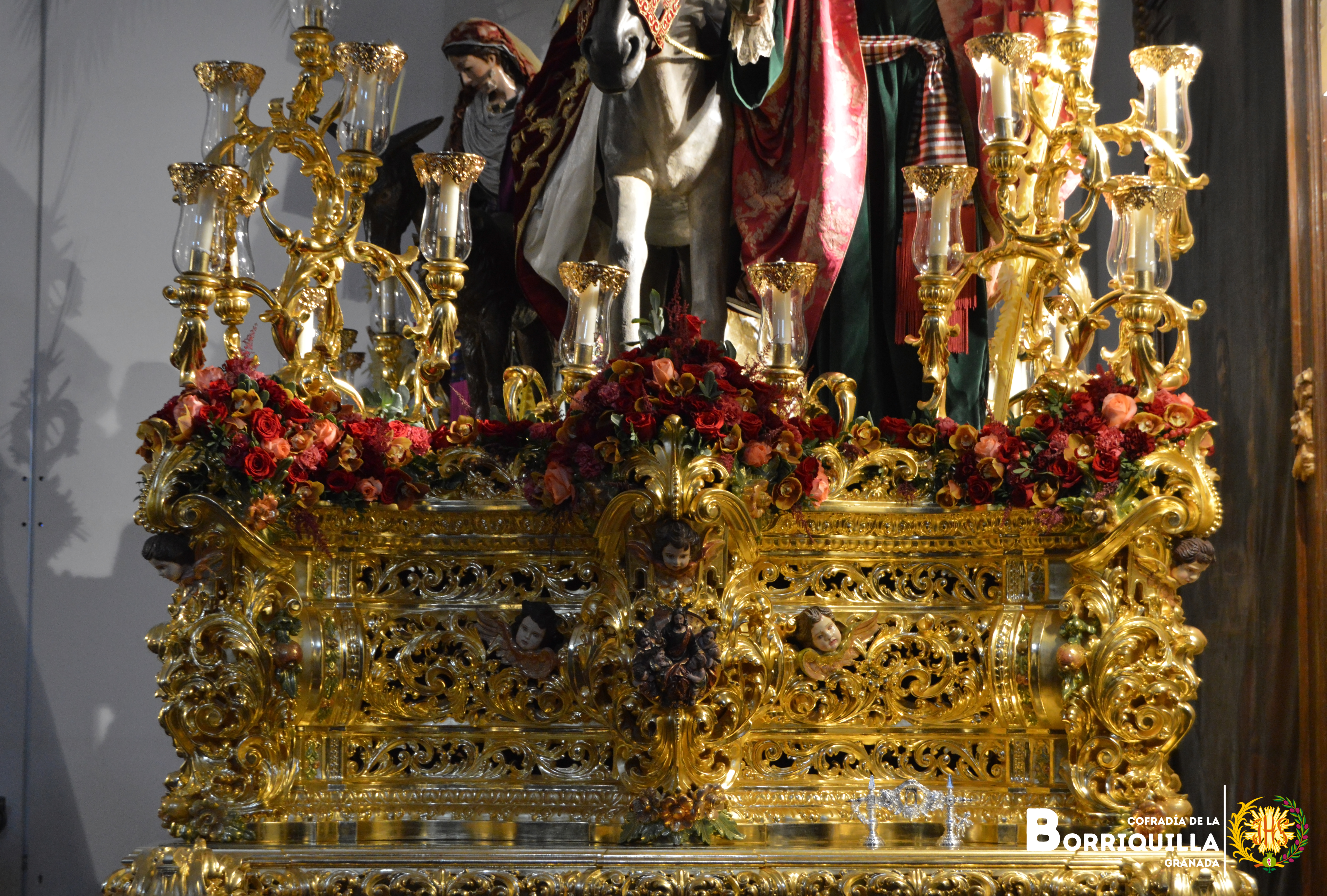 El acompañamiento floral está compuesto por orquídeas en tonos coral y rosáceos, clavel “sangre de toro”, clavel coral, rosas rojas, pitósporum matizado y astilbe en color burdeos. Una combinación que aporta intensidad y viveza al conjunto, realzando la escena de la entrada triunfal del Señor en Jerusalén.