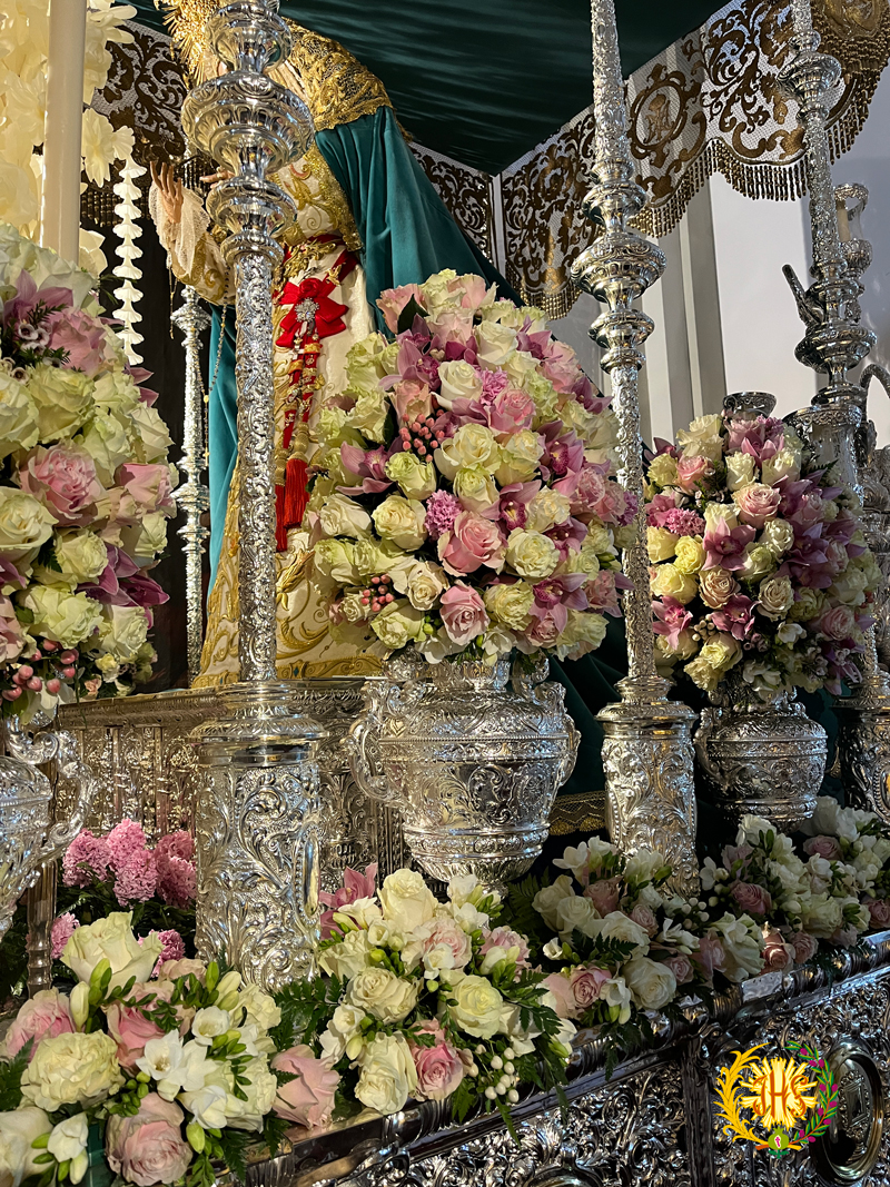 La flor del paso de palio es Jacintos, varas de Orquidias, Rosas mundial, Ross Pink Mondial, Hypericum rosa, Ramificadas, Clavel Colombina, Freesias, Flor de Cera, Eucalipto, Statice, Dendros.