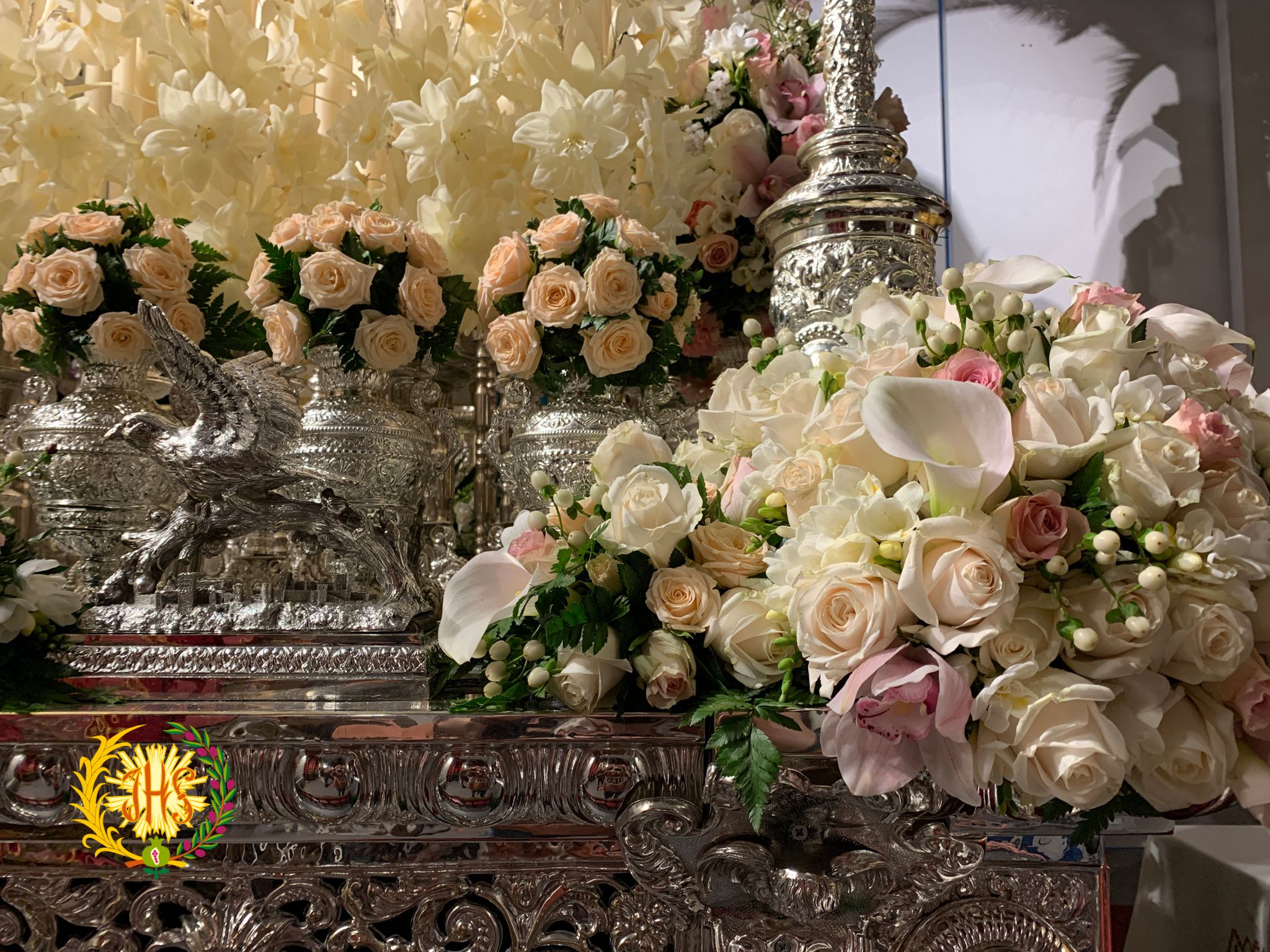 En el paso de palio se pudo observar un exorno más variado, en los tonos que normalmente acompañan a Nuestra Señora de la Paz cada Domingo de Ramos. Este exorno estaba compuesto por rosas rosas, rosa vendela, orquídeas rosas, statice blanco, calas blancas, symphoricarpos albus, flor de arroz y clavel rosa y blanco.