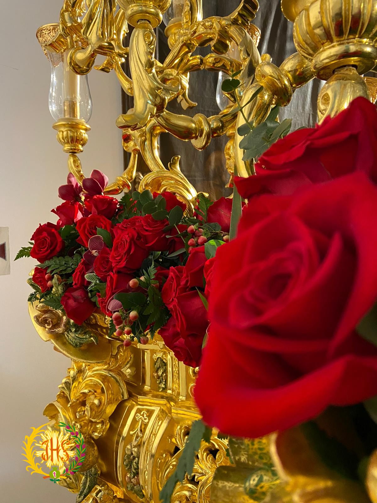 En el paso del señor pudimos ver un estilo más clásico en tonos rojos formado por rosas rojas, orquídeas moradas, ruscus aculeatus y verde africano.