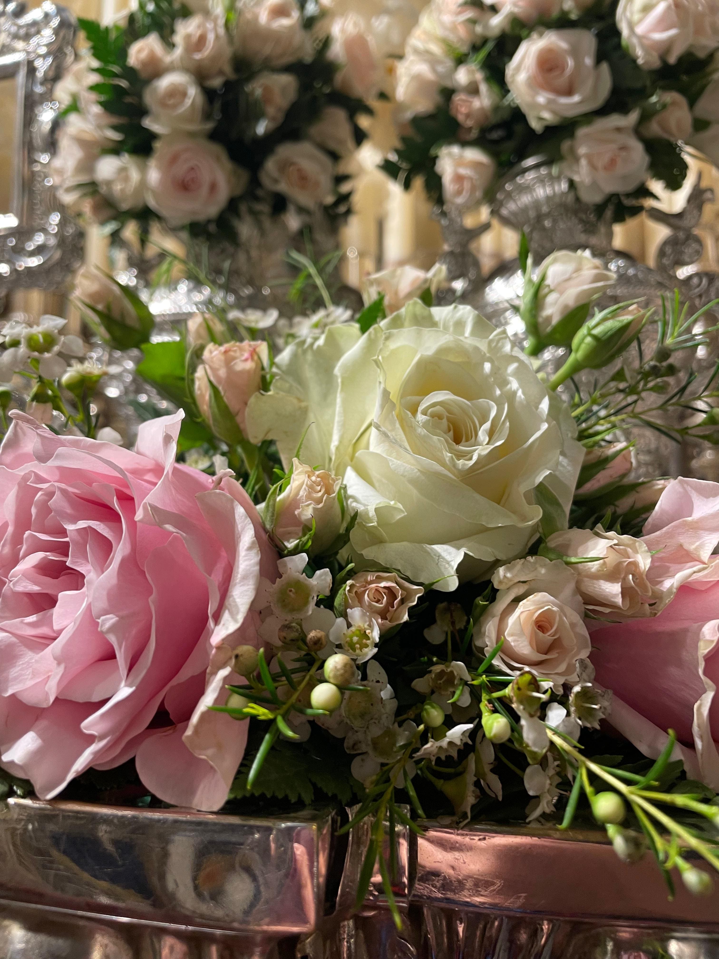 El conjunto floral está compuesto por rosa mundial y rosa punk mondial, combinadas con hypericum blanco, statice blanco ramificado, flor de cera en tonos crema, helecho de cuero y dendrobium blanco con ramificaciones en el mismo color. Una selección que apuesta por la armonía cromática en tonos suaves, aportando luminosidad y serenidad al paso de palio.