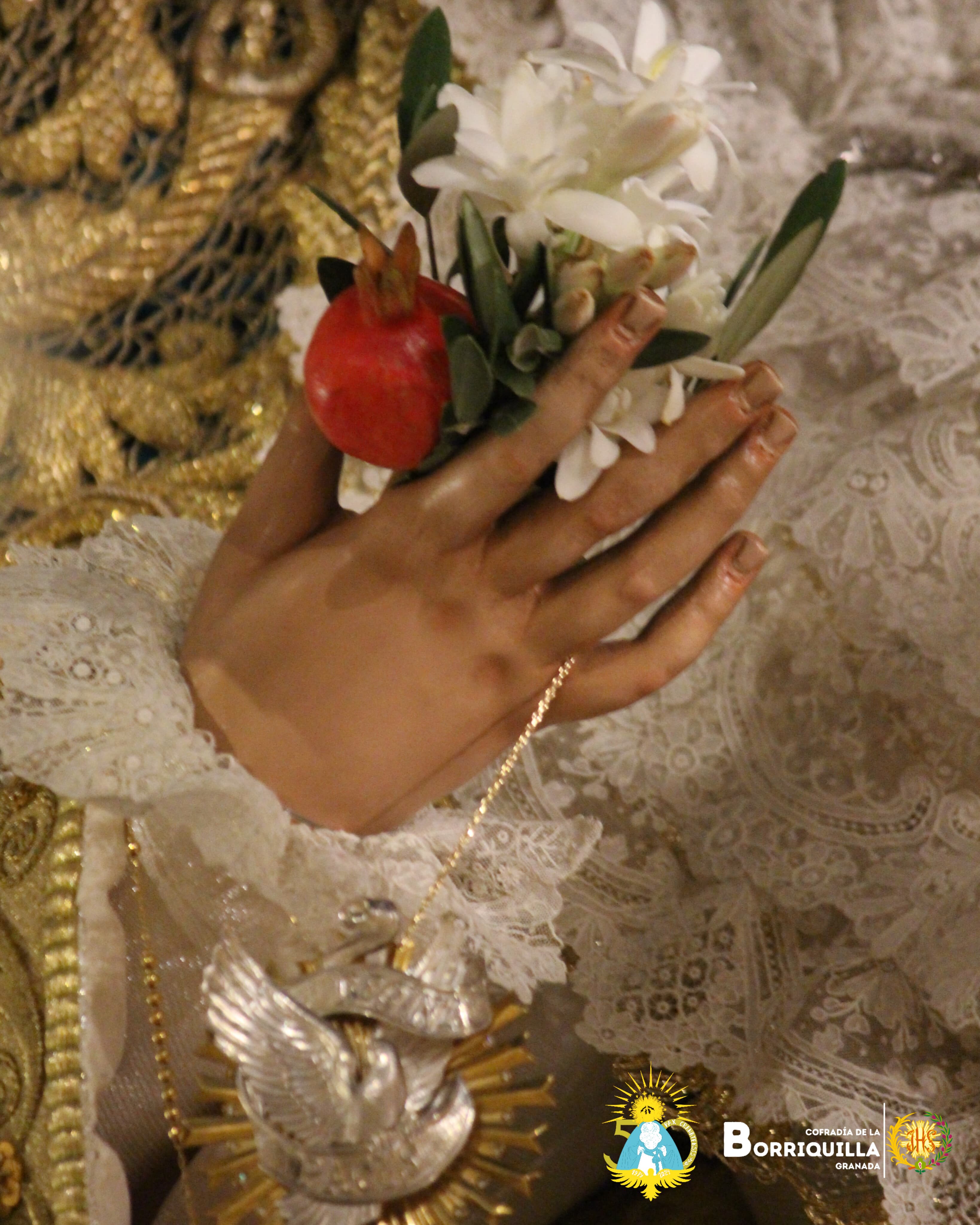 Entre los detalles que engalanan el paso, sobresale el ramillete que porta en la mano Ntra. Sra. de la Paz con la simbólica rama de olivo, símbolo universal de la paz y un claro homenaje a la Entrada de Jesús en Jerusalén, titular de la cofradía, una granada en representación de la ciudad de Granada y la flor de nardo que portó la Virgen de las Angustias en su procesión del pasado Domingo.