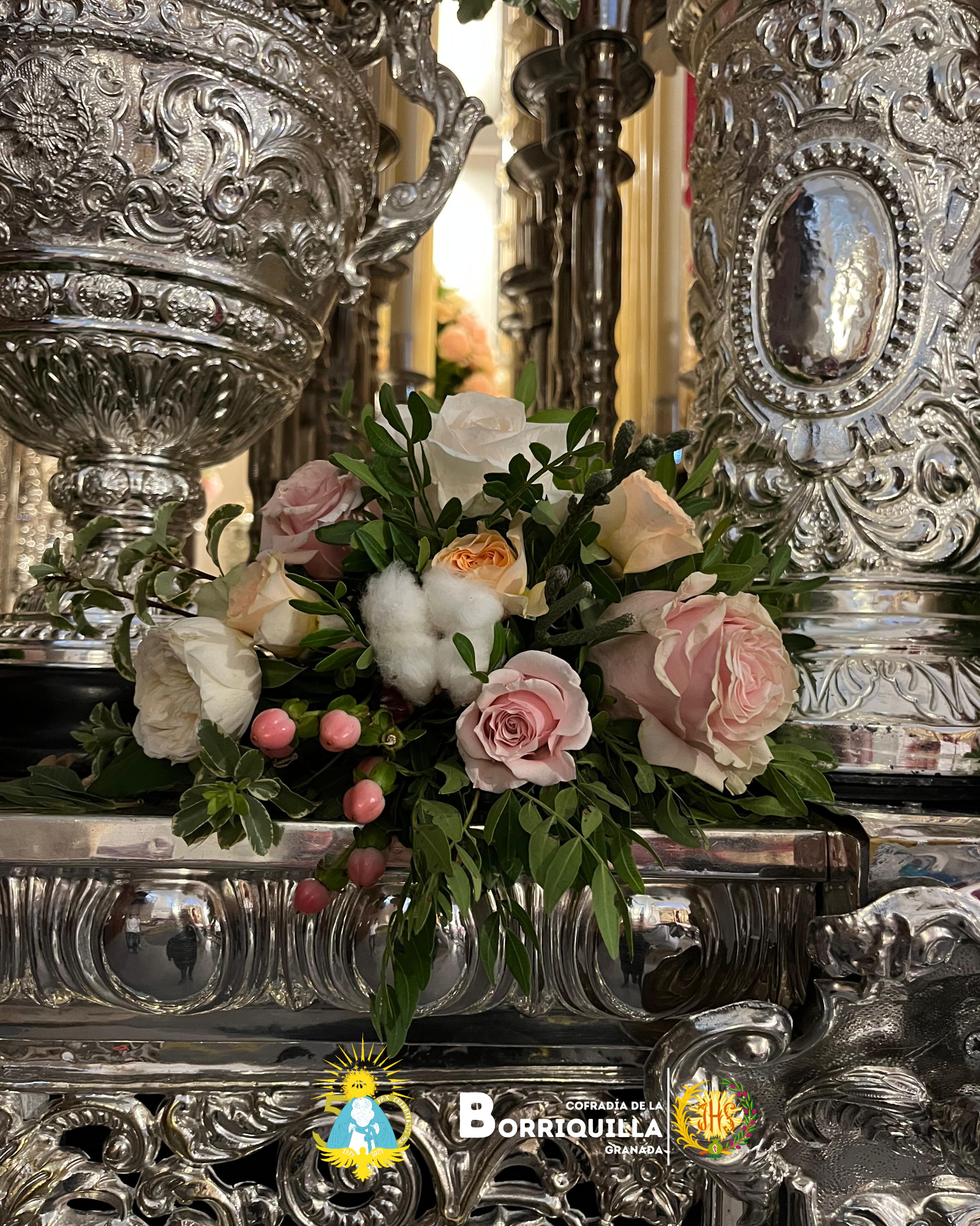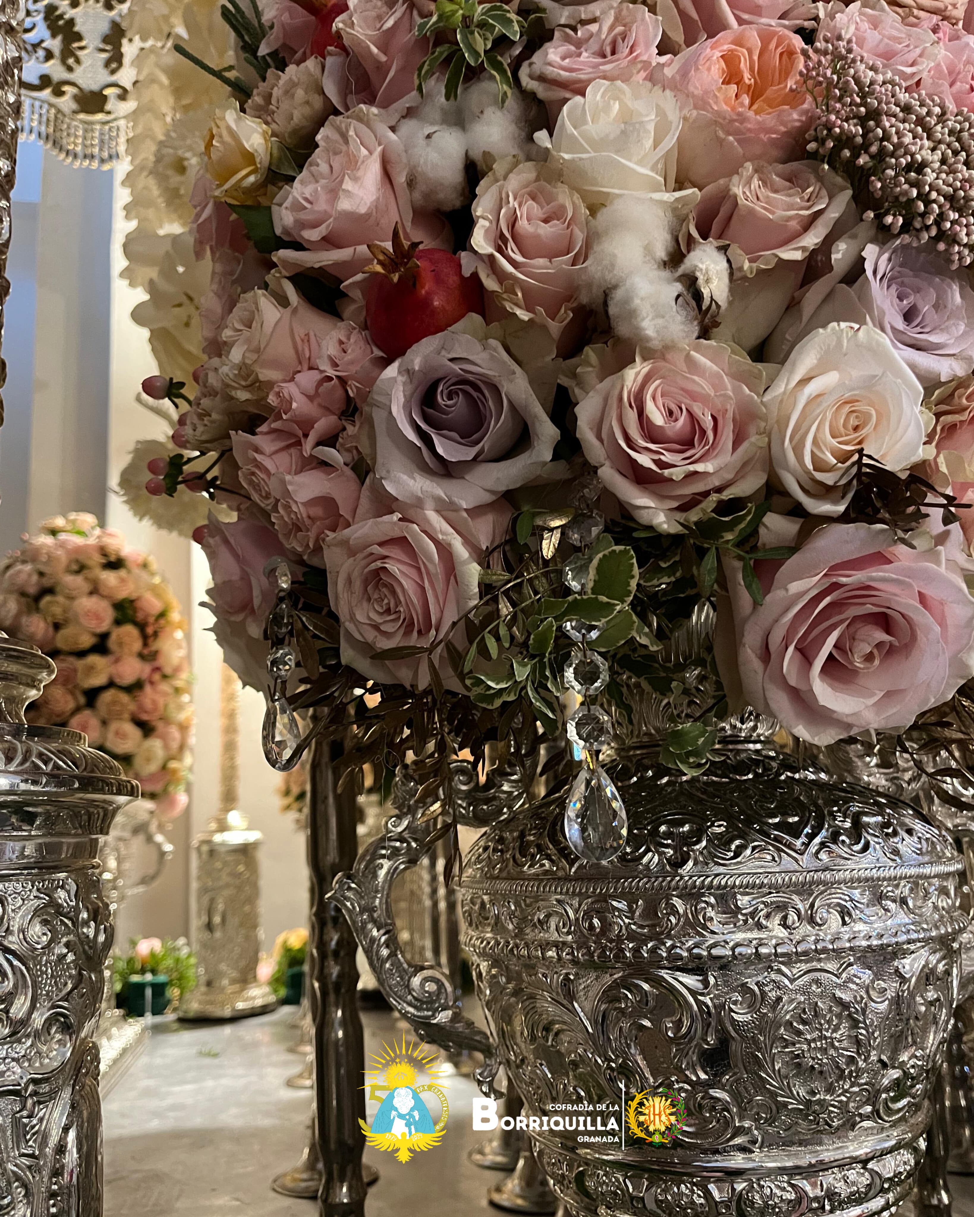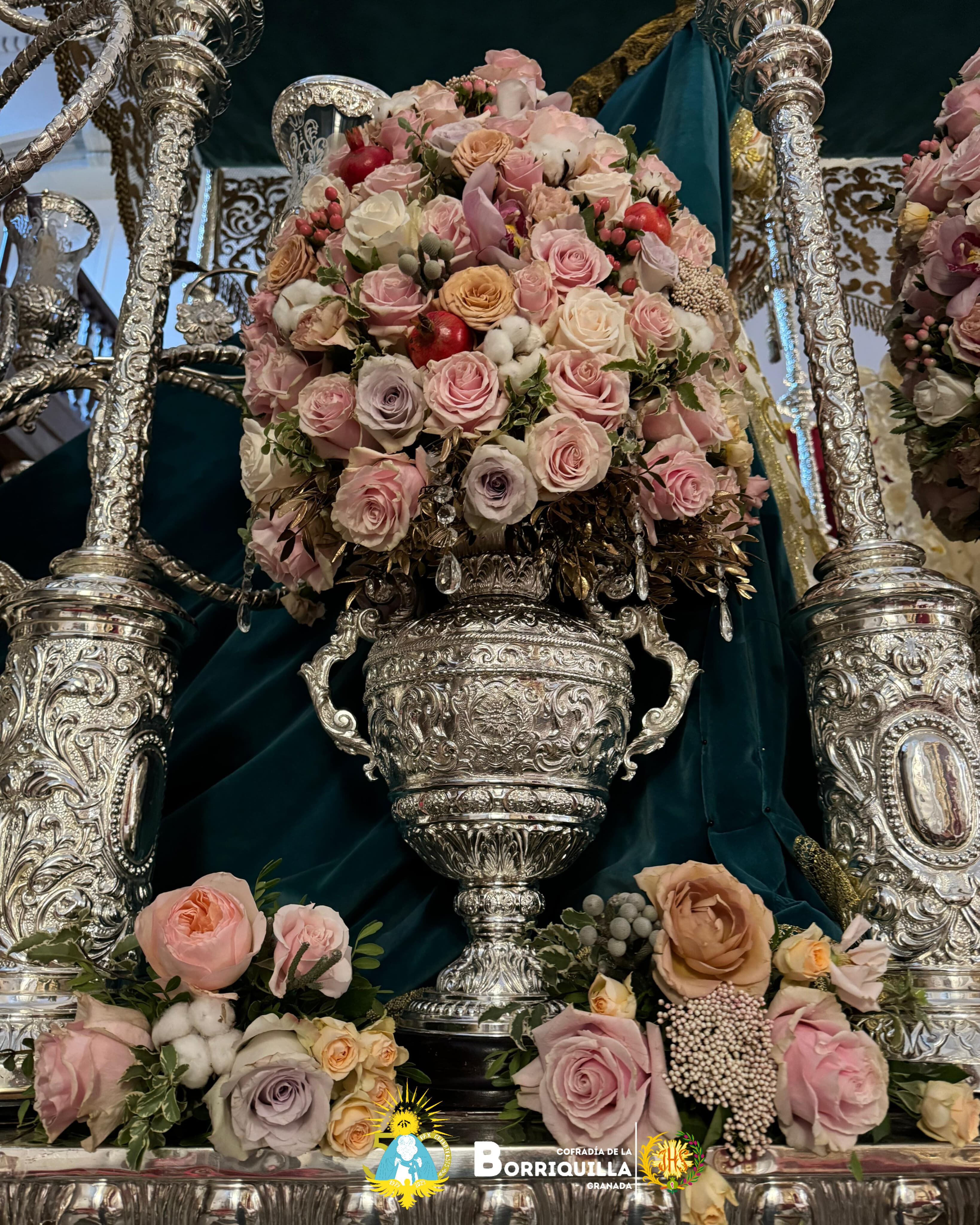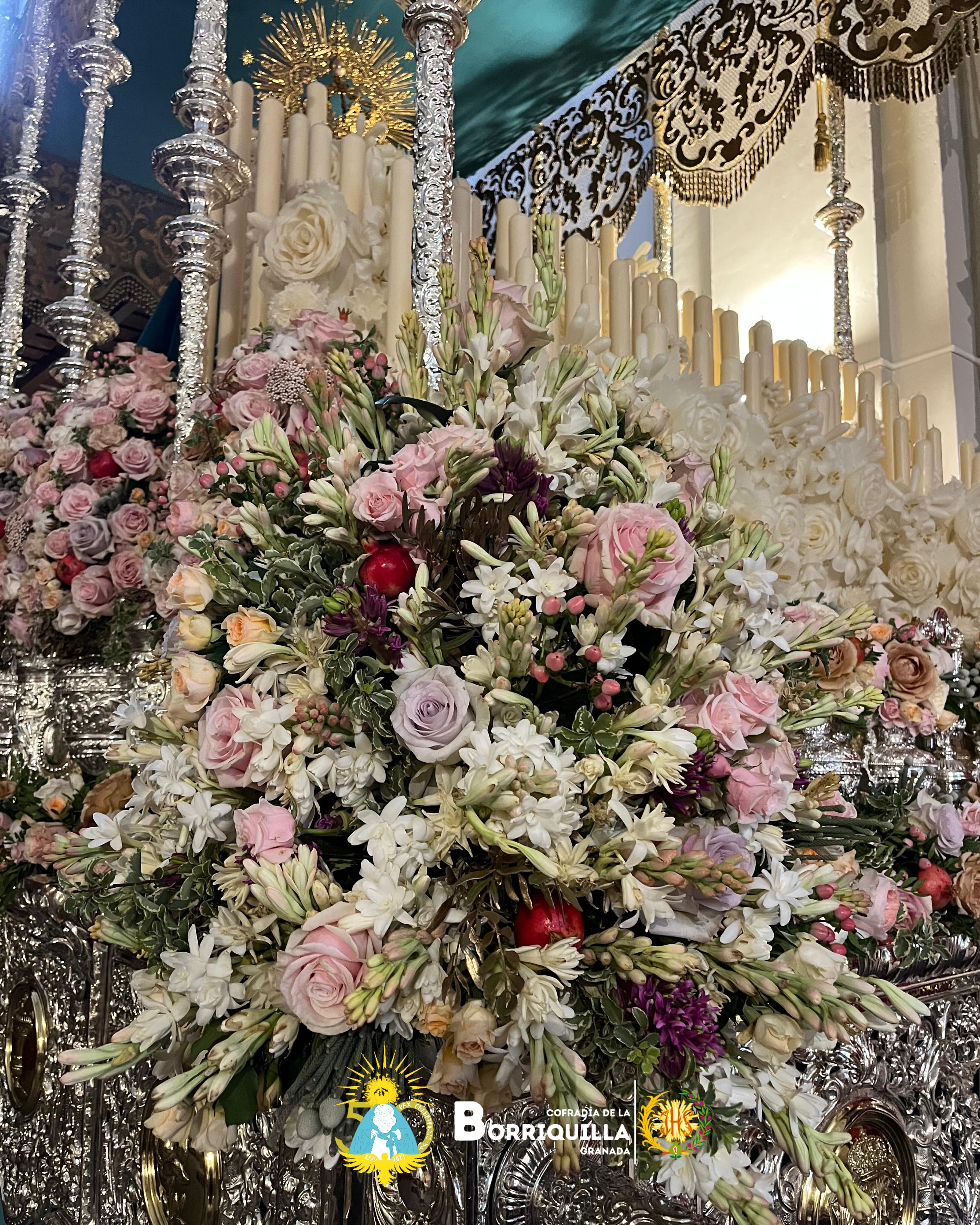 Nuestra Señora de la Paz ha amanecido bajo su palio, decorado con un exorno floral de gran delicadeza y profundo simbolismo. Las flores que la acompañan incluyen rosas de variedades como Quicksand, Vendela y Faith, junto con detalles de hipericum rosa claro, jacintos y claveles caramel. También destacan elementos como ramificada crema y rosa, helecho, lentisco, y la emblemática flor de nardo, que fue también protagonista en la procesión de la Virgen de las Angustias. Además, se han incorporado flores tan especiales como la orquídea en tono empolvado y el algodón.